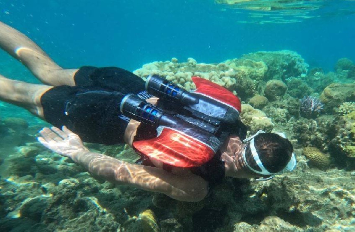 والجهاز مزود ببطارية مدمجة مباشرة في الزعانف الصدرية. تعمل حزمة الليثيوم المُطوّرة خصيصاً على تحسين وقت التشغيل، من خلال التبريد المائي الغامر، بفضل مساحة سطح الزعنفة وشكلها الانسيابي، كما يُمكن فك الزعنفة بالكامل لاستبدال البطارية الفارغة بأخرى جديدة فوراً، حتى دون الحاجة للخروج من الماء.