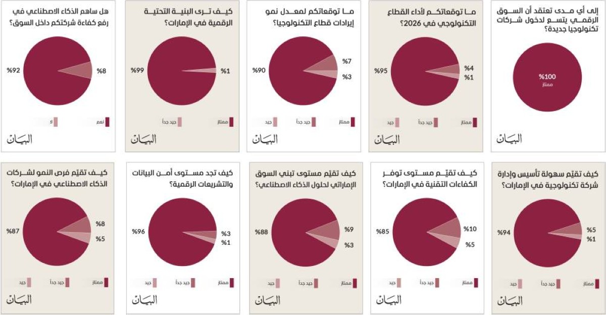 وأجمع المشاركون في الاستبيان على أن التوسع في تبني تقنيات الذكاء الاصطناعي ودمجها في مختلف القطاعات الاقتصادية والخدمية أسهم في تسريع التحول الرقمي، وخلق بيئة جاذبة للابتكار وقادرة على استقطاب الشركات العالمية والكفاءات المتخصصة، وعكست نتائج الاستبيان الثقة الكاملة بمستقبل قطاع التكنولوجيا في الإمارات، حيث يتوقع 95 % من المشاركين أن يسجل القطاع أداءً جيداً جداً خلال 2026.