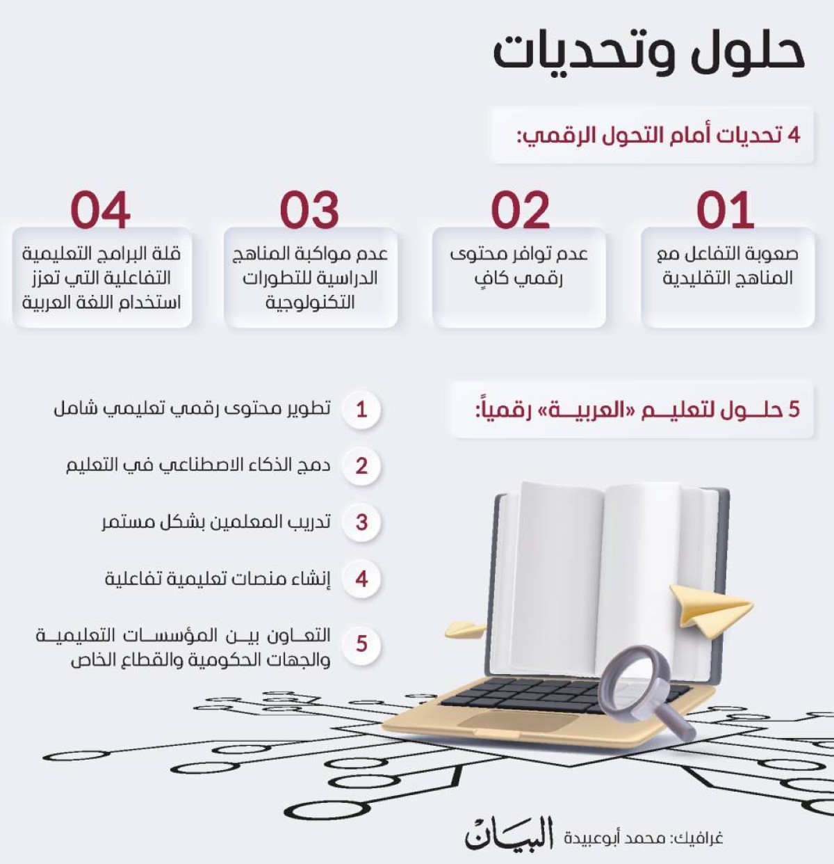 ويدعو المؤسسات التعليمية العربية إلى تبني استراتيجيات شاملة لتوسيع نطاق استخدام اللغة العربية في الفضاء الرقمي، مع ضرورة إنشاء منصات تعليمية مبتكرة تقدم محتوى تفاعلياً يجذب اهتمام الطلاب.