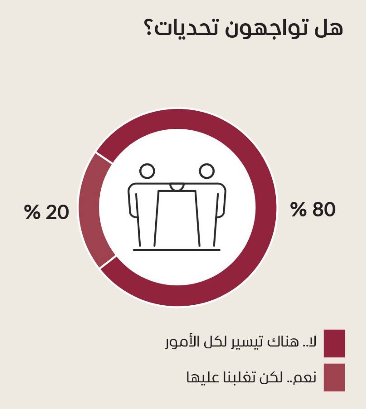 أما عن التحديات التي تواجههم ويمكن تلافيها حتى يستمروا في تقديم خدماتهم للجمهور فقد أكد 80 % منهم أن هناك تيسيراً لكل الأمور، ولا يجدون أي تحديات، بينما قال 20 % إنهم وجدوا تحديات بالفعل، ولكنهم تغلبوا عليها.