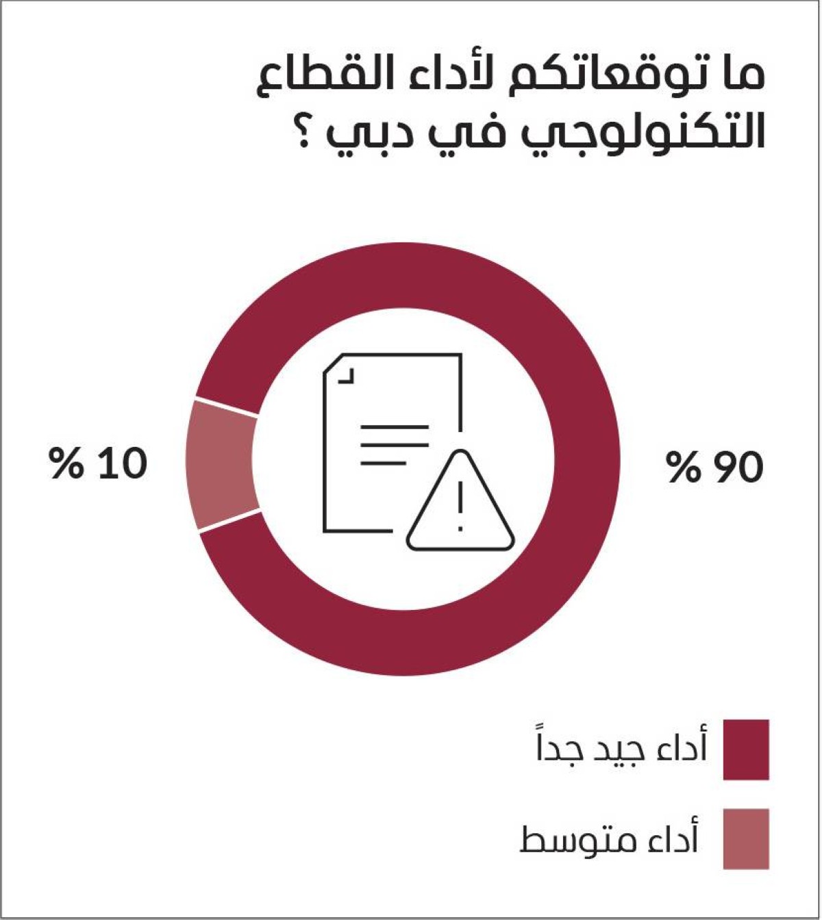 في البداية توقع 90 % أن يكون أداء القطاع التكنولوجي في دبي في 2025 جيداً جداً، في حين توقع 10 % منهم فقط أن يكون الأداء متوسطاً.