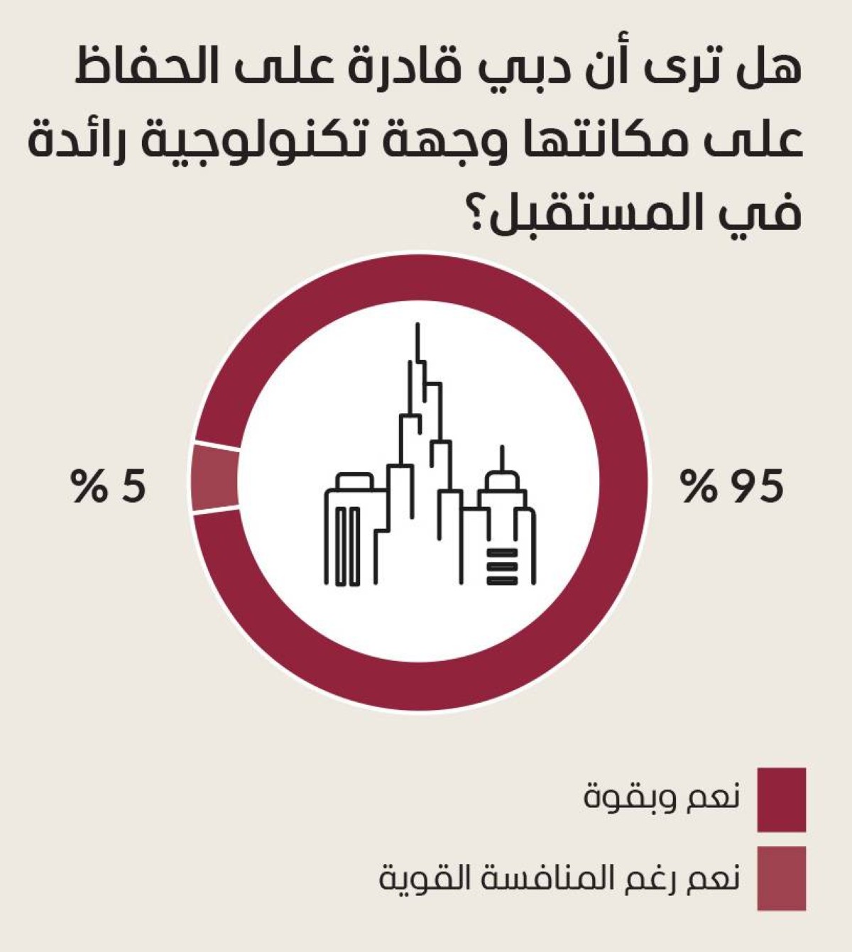 وكان السؤال الأخير عن مدى قدرة دبي على الحفاظ على مكانتها بوصفها وجهة تكنولوجية رائدة في المستقبل أكد 95 % أنها قادرة وبقوة، وأيدهم كذلك النسبة المتبقية، وهي 50 %، ولكنهم أضافوا أنه يجب الانتباه إلى المنافسة الشرسة في هذا القطاع الحيوي.