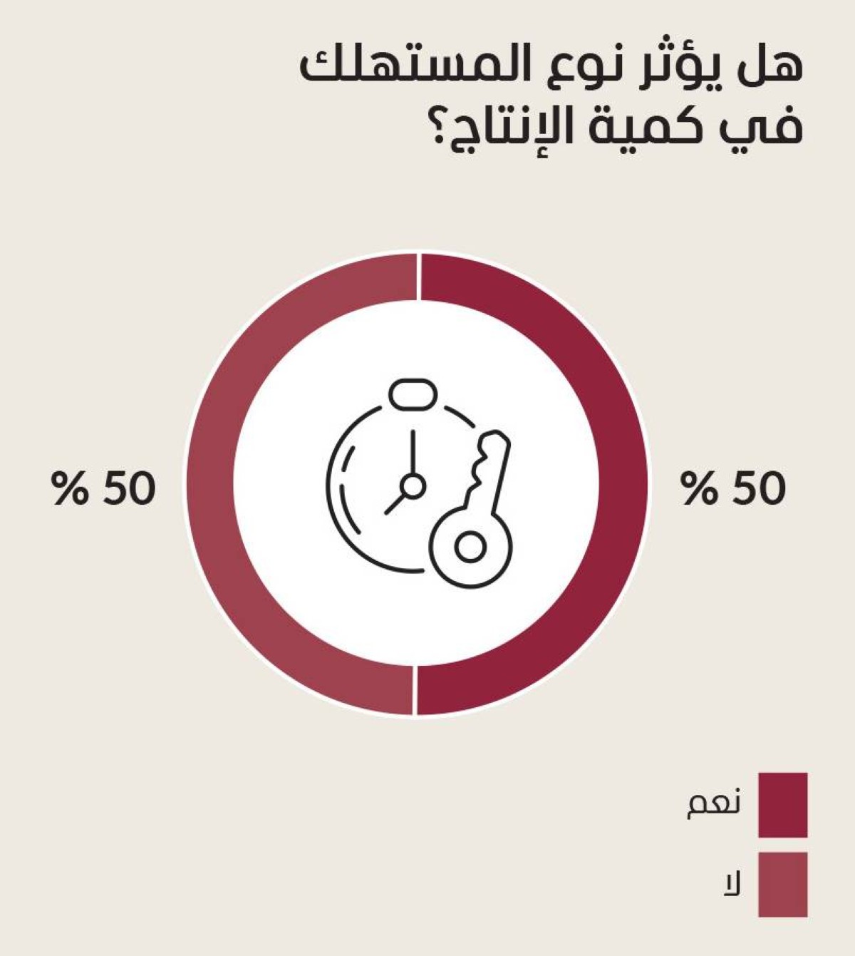 وأما عن مدى تأثير نوع المستهلك (ذكراً وأنثى) في كمية تصنيع المنتجات وطرحها في الأسواق فقال 50 % إن النوع يؤثر بالفعل، بينما رأى الـ 50 % الآخرون أنه لا فرق بين النوعين في تصنيع المنتجات أو تسويقها.