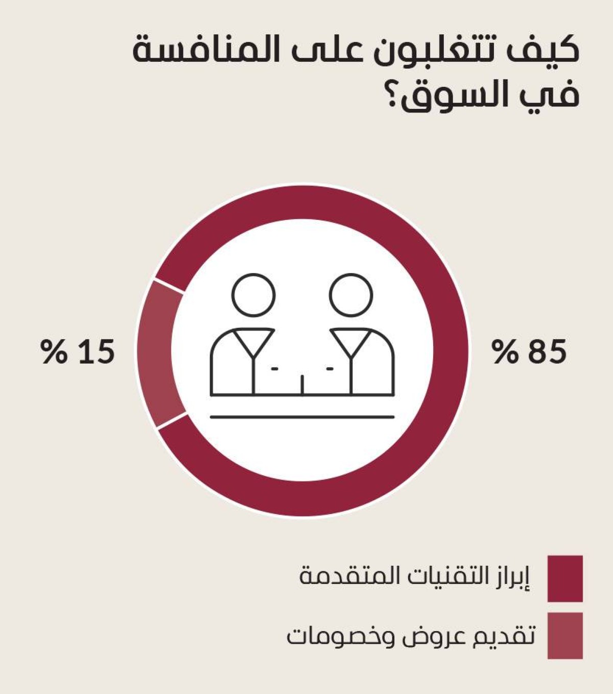 وكان السؤال التالي: كيف يمكنكم جعل المنافسة مفيدة لكل من المستخدمين والشركات المتخصصة في هذا القطاع الحيوي؟ ليجيب 85 % بأن الحل في إبراز التقنيات المتقدمة، في حين فضل 15 % تقديم عروض وخصومات.