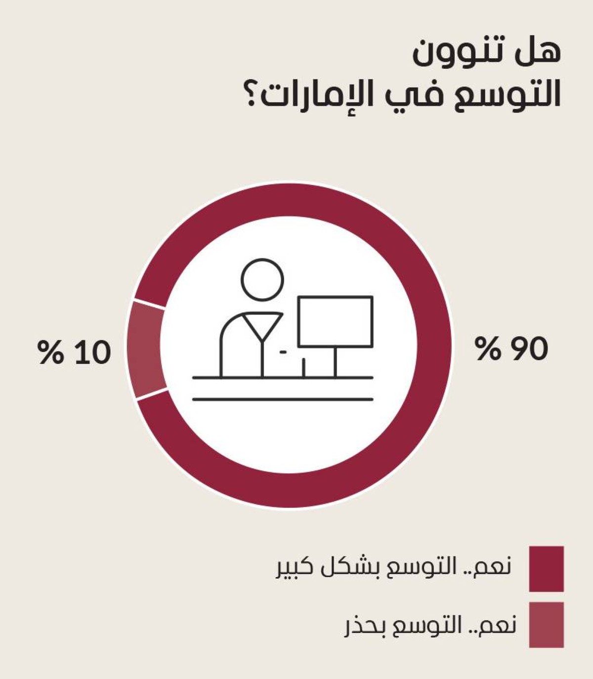 وبسؤالهم عن خططهم للاستفادة من التنوع الثقافي الموجود في الإمارات، وخصوصاً في دبي، قال 90 % منهم إنهم ينوون التوسع بشكل كبير، وقال 10 % إنهم سوف يتوسعون، ولكن بحذر.