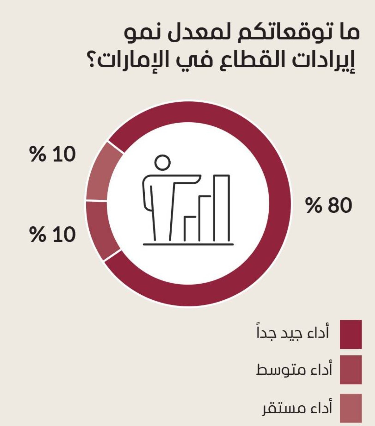 وعن توقعاتهم لمعدل نمو الإيرادات في قطاع التكنولوجيا في الإمارات قال 80 % إنهم يتوقعون أن يكون جيداً جداً، و10 % توقعوا أن يكون متوسطاً، و10 % توقعوا أن يكون مستقراً.