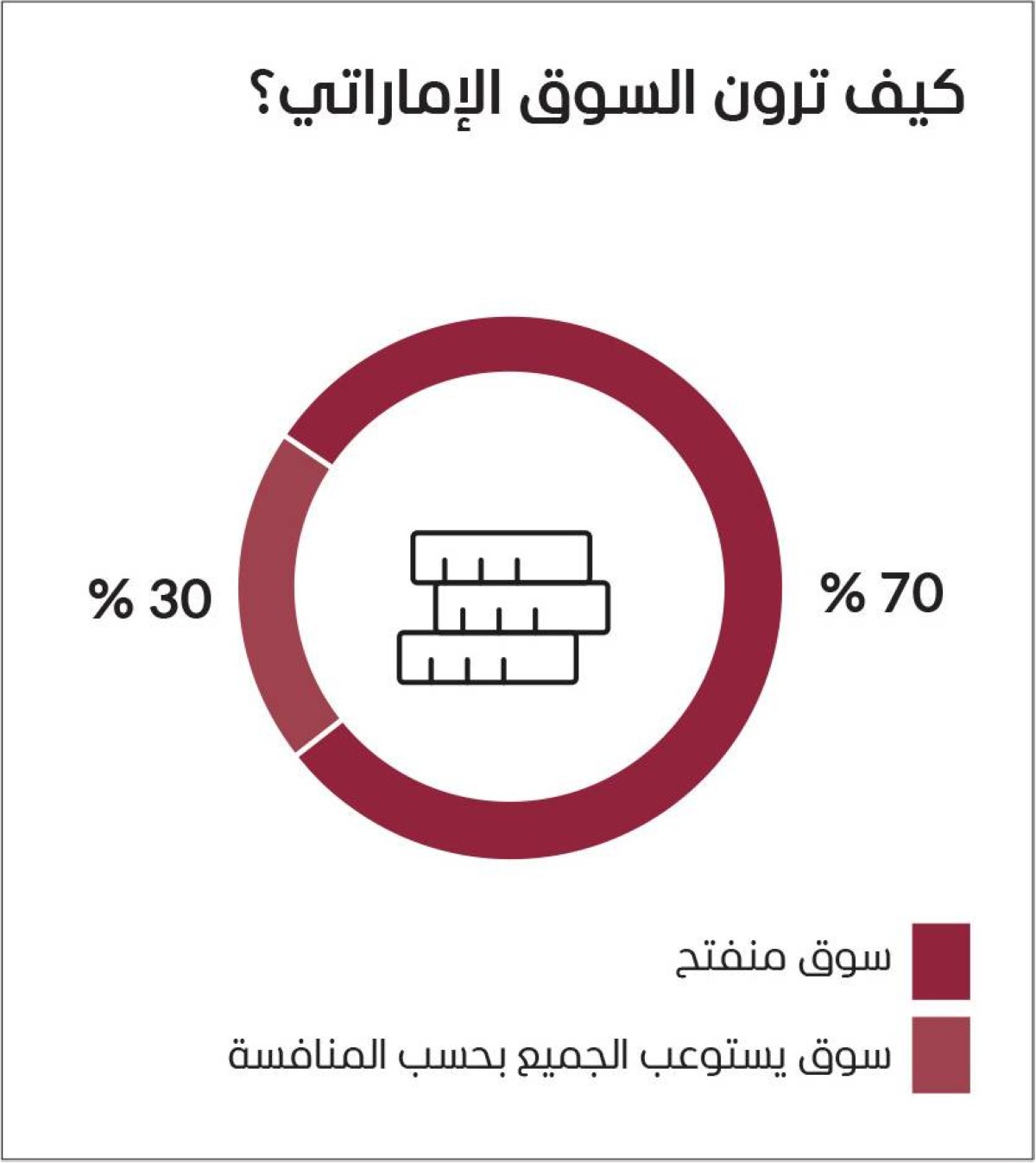 وبسؤالهم: كيف ترون السوق الإماراتي؟ أجاب 70 % منهم بأنه سوق منفتح، وقال 30 % إنه سوق يستوعب الجميع، ولكن الفيصل في الأمر هو المنافسة.