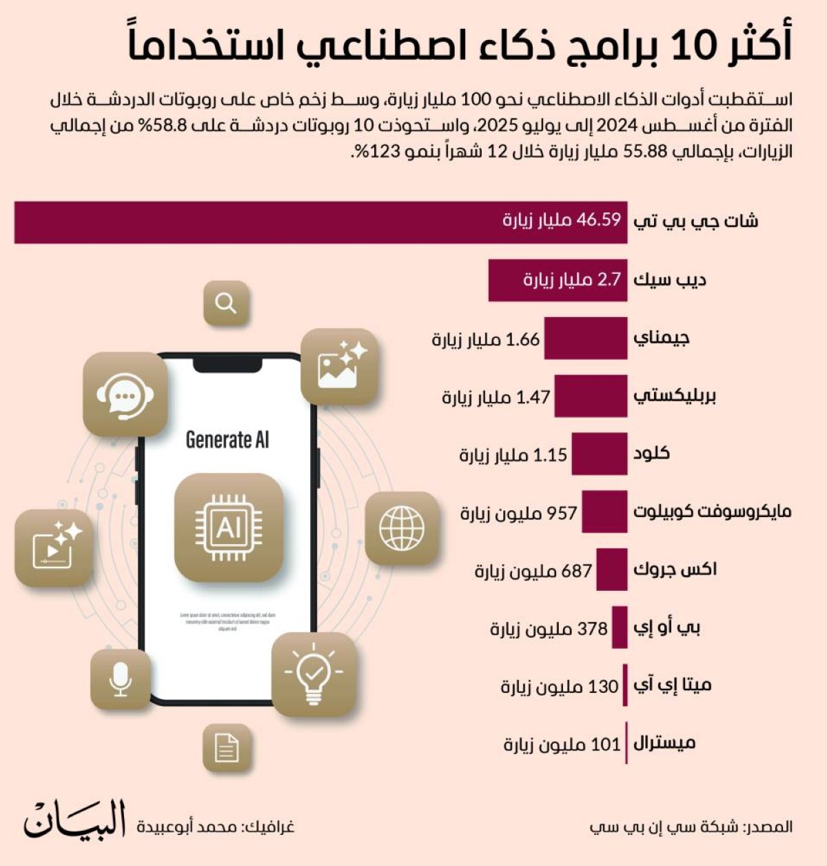 استقطبت أدوات الذكاء الاصطناعي نحو 100 مليار زيارة، وسط زخم خاص على روبوتات الدردشة خلال الفترة من أغسطس 2024 إلى يوليو 2025 ، واستحوذت 10 روبوتات دردشة على 58.8 % من إجمالي الزيارات، بإجمالي 55.88 مليار زيارة خلال 12 شهراً بنمو 123 %.