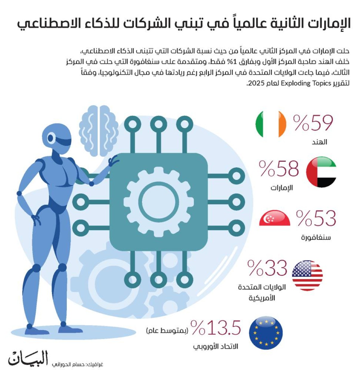 حلت الإمارات في المركز الثاني عالمياً من حيث نسبة الشركات التي تتبنى الذكاء الاصطناعي، خلف الهند صاحبة المركز الأول وبفارق 1% فقط، ومتقدمة على سنغافورة التي حلت في المركز الثالث، فيما جاءت الولايات المتحدة في المركز الرابع رغم ريادتها في مجال التكنولوجيا، وفقاً لتقرير Exploding Topics لعام 2025.