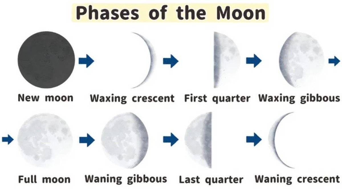 كما أن القمر يختلف حسب أطواره، فعندما يكون القمر هلالًا، يراه سكان النصف الشمالي بشكل منحني من جهة معينة، بينما يظهر بالعكس في النصف الجنوبي. قرب خط الاستواء، قد يبدو الهلال كأنه "قارب" أو ابتسامة، وهو شكل أقل شيوعاً في المناطق البعيدة عن خط الاستواء وفق لايف ساينس.