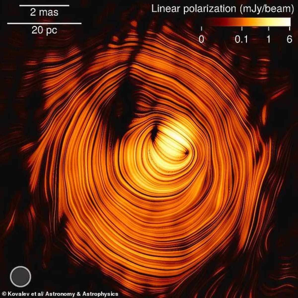 ووصف يوري كوفاليف، الباحث الرئيسي من معهد ماكس بلانك لعلم الفلك الراديوي، المشهد قائلاً: "عندما أعدنا بناء الصورة، بدا المشهد مذهلاً للغاية. لم نشاهد شيئًا مثله من قبل - مجال مغناطيسي حلقي شبه مثالي مع نفاثة متجهة مباشرة نحو الأرض."