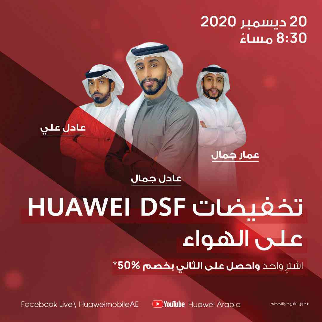 وسيتم بث حدث تخفيضات HUAWEI DSF المباشر باللغة العربية في 20 ديسمبر الجاري من قبل نجم كرة القدم عادل جمال وشقيقه عمار جمال إلى جانب عادل علي، وذلك في تمام الساعة 8:30 مساءً [بتوقيت الإمارات].