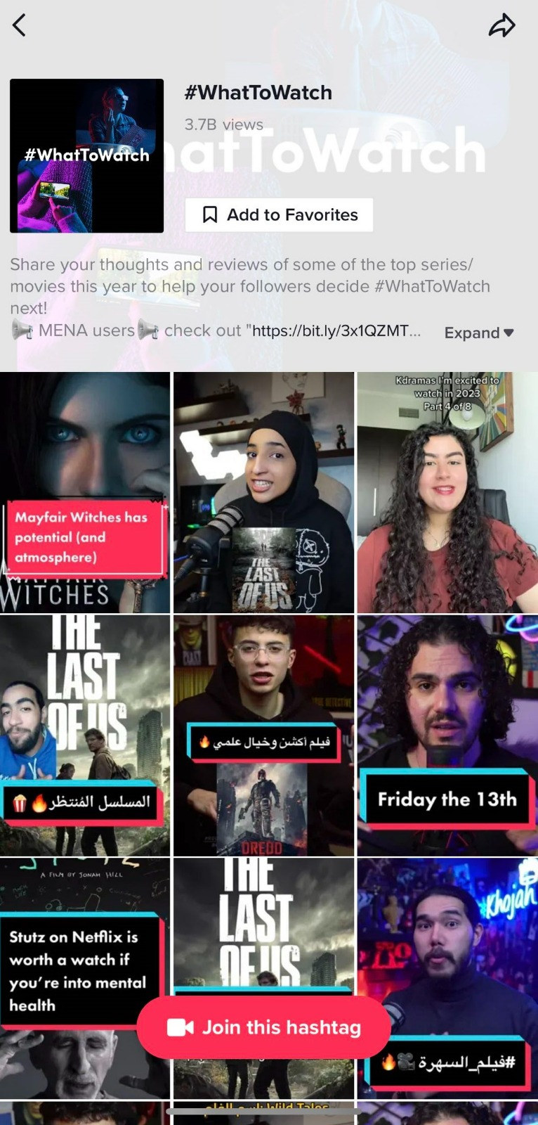 ومن أجل تلبية احتياجات مجموعة متنوعة من المستخدمين والثقافات في جميع أنحاء المنطقة، أصبح هاشتاغ #اتفرج_على_تيك_توك الوجهة المفضلة للأشخاص الذين يرغبون في التعبير عن إعجابهم وتقديرهم لأفلامهم ومسلسلاتهم المفضّلة أو تقييم الأفلام أو مشاركة المحتوى الرائج ومقتطفات من البرامج الاجتماعية. وتُعدّ صالة النجوم ومشاهير التي تضم نجوماً صاعدين واحدة من أكثر أركان التفاعل المحبّبة بالنسبة للمستخدمين، وذلك بالإضافة إلى قسم اثير صانعي المحتوى الذي يحتوي على أفضل التوصيات والمحتوى الذي يجب مشاهدته وفقاً لأبرز المبدعين والمراجعين على تيك توك.