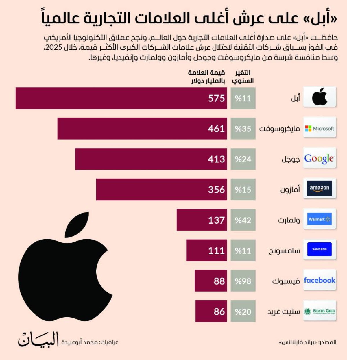 حافظت »أبل « على صدارة أغلى العلامات التجارية حول العالم، ونجح عملاق التكنولوجيا الأمريكي في الفوز بسباق شركات التقنية لاحتلال عرش علامات الشركات الكبرى الأكثر قيمة، خلال 2025 ، وسط منافسة شرسة من مايكروسوفت وجوجل وأمازون وولمارت وإنفيديا، وغيرها.