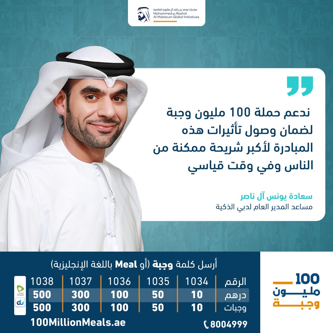وقال سعادة يونس آل ناصر، مساعد المدير العام لدبي الذكية، المدير التنفيذي لمؤسسة بيانات دبي: " نحن سعداء بأن نكون شريكاً داعماً لمبادرة "100 مليون وجبة" التي أطلقها صاحب السمو الشيخ محمد بن راشد آل مكتوم نائب رئيس الدولة رئيس مجلس الوزراء حاكم دبي "رعاه الله"، مشيرا إلى أن دبي الذكية تضع من من خلال هذه الحملة خدماتها وحلولها الرقمية لدعم وخدمة المبادرة الإنسانية في تحقيق أهدافها، ويشكل دعمنا للمبادرة بالتعاون مع فريق مبادرات محمد بن راشد آل مكتوم العالمية، أحد أوجه اهتمامنا بتوفير قنوات ذكية لجميع الخدمات وتحديداً خدمات التبرع باستخدام تطبيق "دبي الآن"، لضمان وصول تأثيرات هذه المبادرات لأكبر شريحة ممكنة من الناس وفي وقت قياسي " .