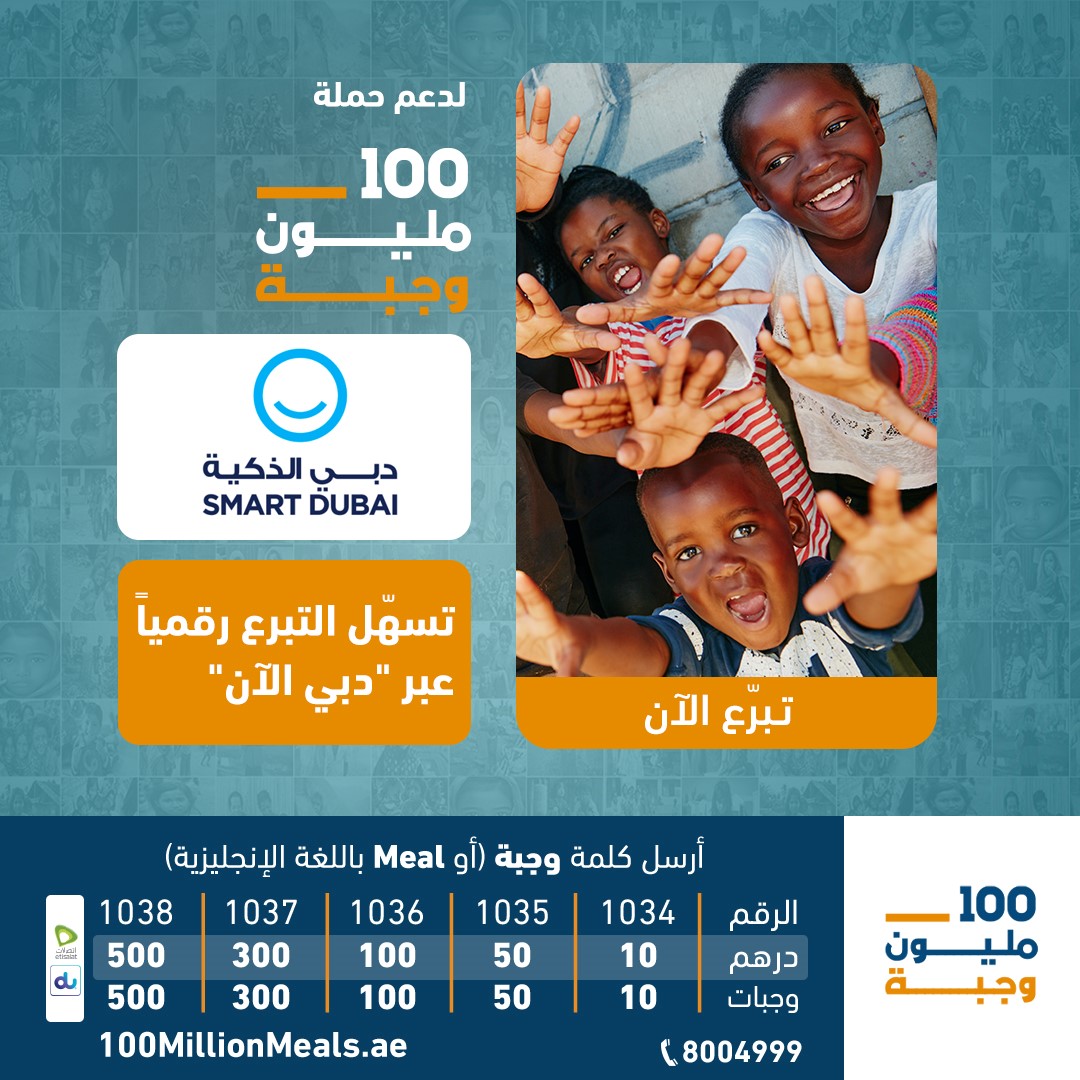 وتسهل دبي الذكية عملية تبرع المؤسسات والأفراد وقطاعات الأعمال من داخل دولة الإمارات وخارجها لحملة 100 مليون وجبة وتقديم تبرعاتهم المالية من خلال توفير القناة الخامسة للتبرعات عبر تطبيق "دبي الآن"، إذ توفر الحملة أربع قنوات أخرى هي الموقع الإلكتروني www.100millionmeals.ae ، والتحويل المصرفي لحساب حملة 100 مليون وجبة في "بنك دبي الإسلامي"، ورقمه: (AE08 0240 0015 2097 7815 201)، أو من خلال الرسائل النصية القصيرة (SMS) عبر الأرقام الموضحة على الموقع الإلكتروني وذلك لمستخدمي شبكتي "دو" و"اتصالات" داخل دولة الإمارات، وكذلك التبرع بالتواصل مباشرة مع فريق الحملة في مركز الاتصال على الرقم المجاني 8004999 أو البريد الإلكتروني: info@100MillionMeals.ae .