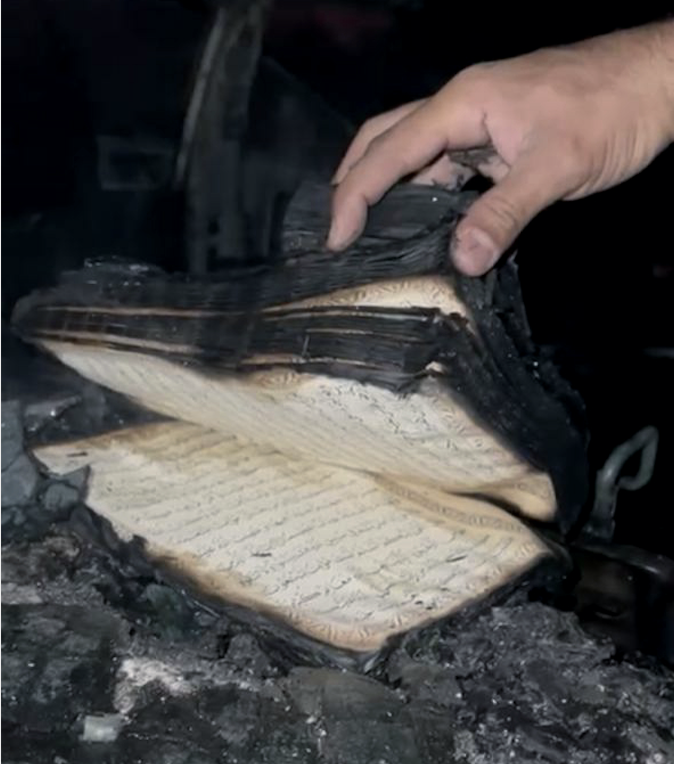 وأظهر الفيديو احتراق السيارة كاملاً، فيما بقي المصحفان سليمين، لم تمسهما النار.