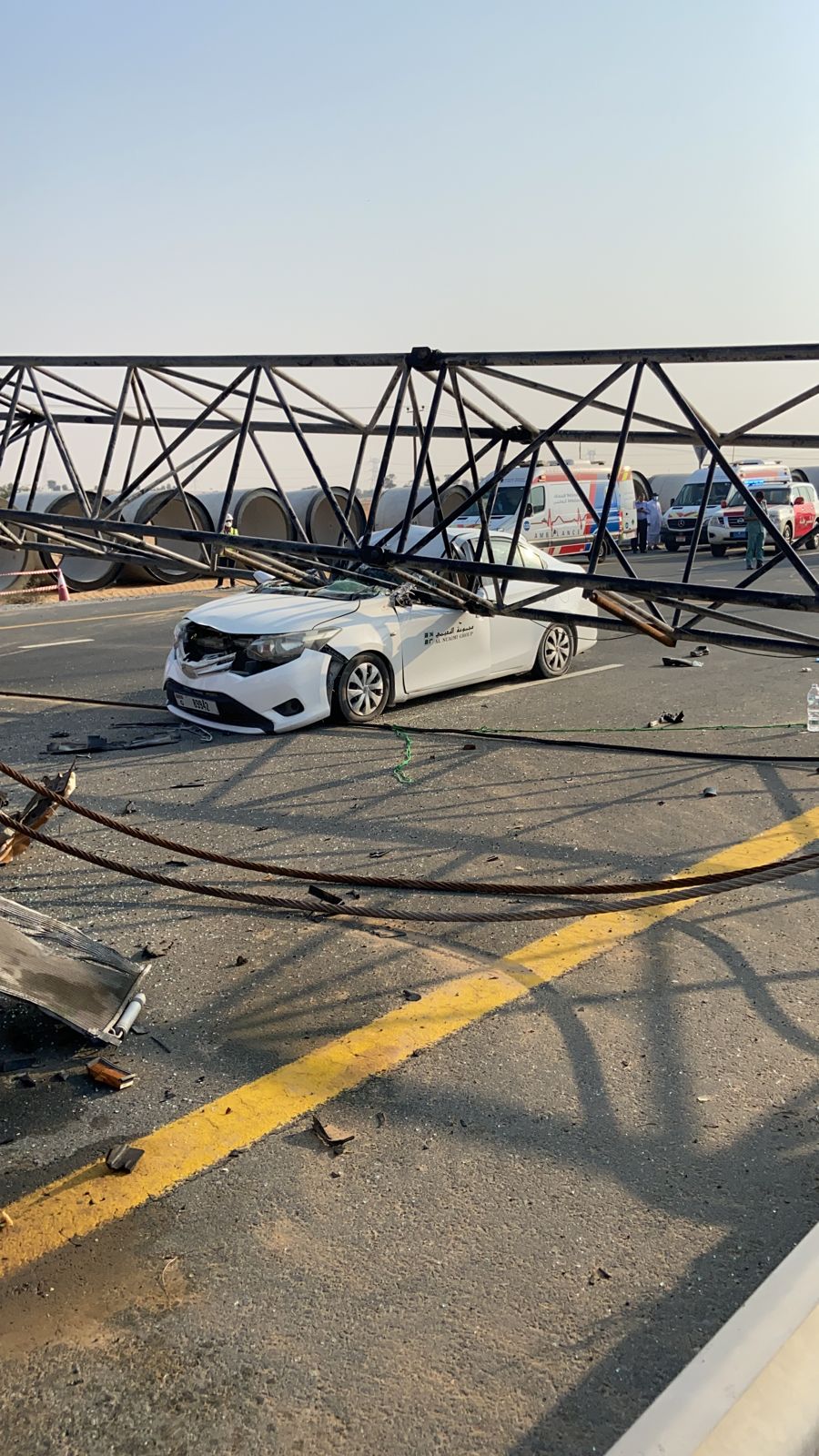 أصيب سائقان بعد سقوط عمود رافعة على مركبتيهما بشارع الإمارات في أم القيوين.