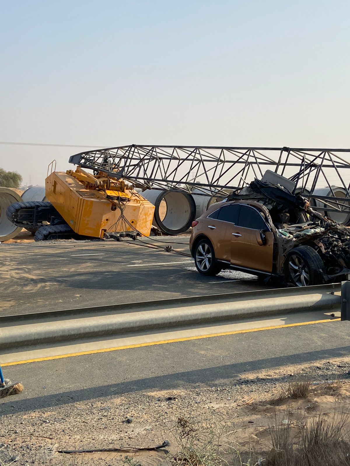 وانتقل لمكان الحادث العميد خميس سالم بوهارون مدير عام العمليات الشرطية بشرطة أم القيوين والذي قال ان سائق الرافعة آسيوي الجنسية المتسبب بالحادث كان يرفع أنبوباً من الخرسانة الإسمنتية يزن قرابة 20 طنا على شارع الإمارات باتجاه رأس الخيمة، وعندما اقترب من وضع الأنبوب على الأرض انفصل الحبل عن الأنبوب ما أدى إلى رجوع عمود الرافعة للخلف بقوة وسقوطه على الشارع العام مسبباً إتلاف مركبتين وإصابة سائقيهما بإصابات متفرقة ، نقلا على إثرها إلى مستشفى الشيخ خليفة لتلقي العلاج بواسطة طيران الشرطة (جناح الجو).