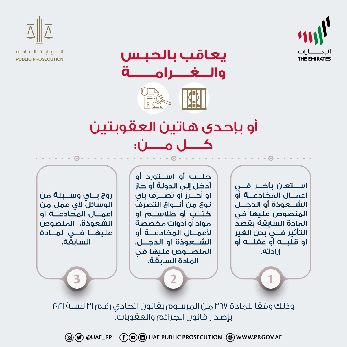 كما نصت المادة 367 من ذات المرسوم بقانون على انه يعاقب بالحبس والغرامة أو بإحدى هاتين العقوبتين كل من استعان بآخر في أعمال المخادعة أو الشعوذة أو الدجل المنصوص عليها في المادة السابقة بقصد التأثير في بدن الغير أو قلبه أو عقله أوإرادته ..وكل من جلب أو استورد أو أدخل إلى الدولة أو حاز أو أحرز أو تصرف بأي نوع من أنواع التصرف في كتب أو طلاسم أو مواد أو أدوات مخصصة لأعمال المخادعة أو الشعوذة أو الدجل المنصوص عليها في المادة السابقة ..وكل من روج بأي وسيلة من الوسائل لأي عمل من أعمال المخادعة أو الشعوذة المنصوص عليها في المادة السابقة.