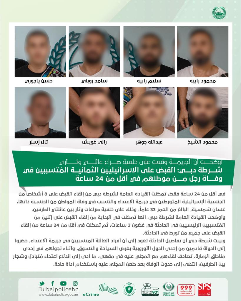 في أقل من 24 ساعة فقط، تمكنت القيادة العامة لشرطة دبي من إلقاء القبض على 8 أشخاص من الجنسية الإسرائيلية المتورطين في جريمة الاعتداء والتسبب في وفاة مواطن من الجنسية ذاتها، يُدعى غسان شمسية، البالغ من العمر 33 عاماً، وذلك على خلفية صراعات وثأر بين عائلتي الطرفين.