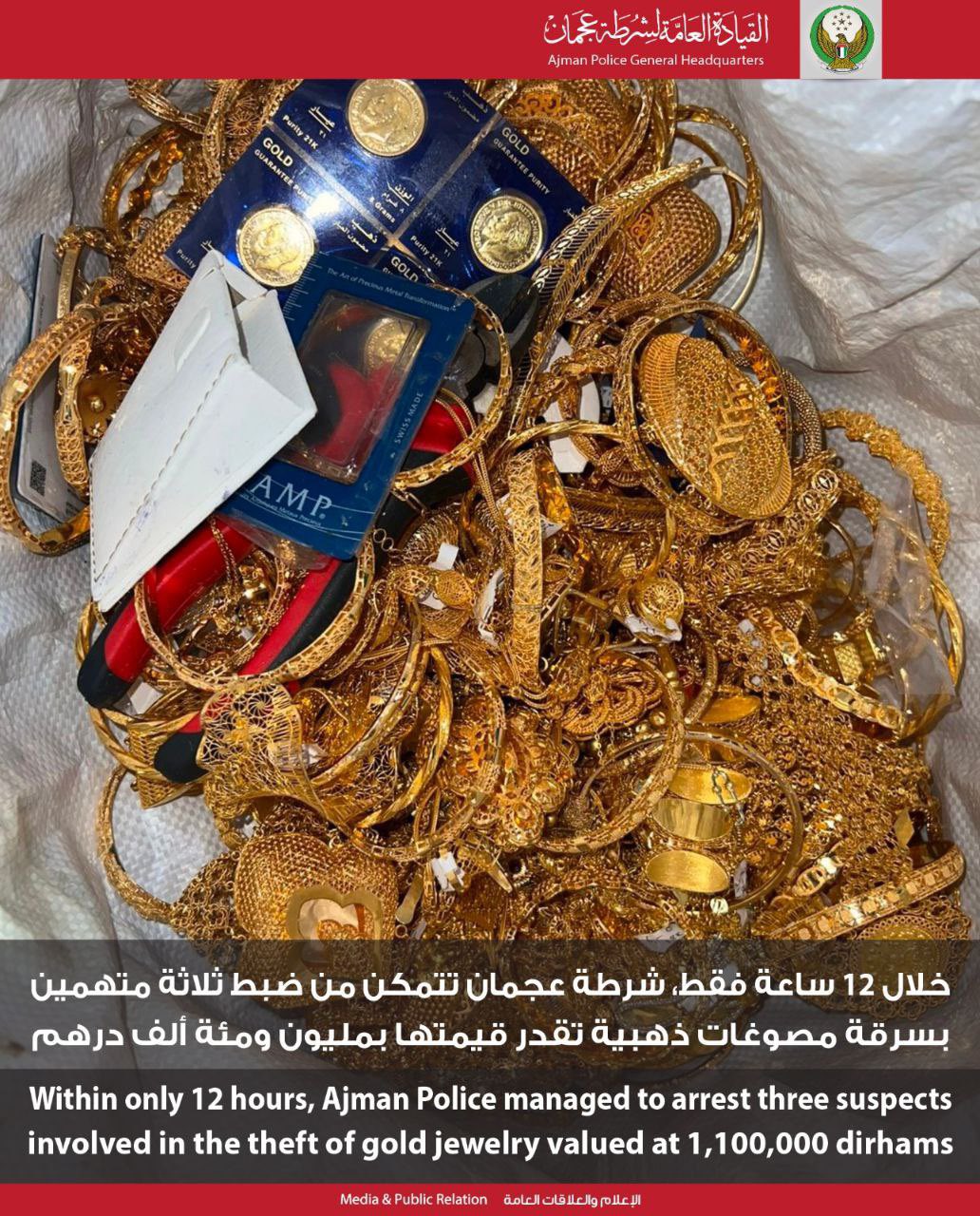 تمكنت القيادة العامة لشرطة عجمان من إلقاء القبض على ثلاثة أشخاص من الجنسية العربية بعد 12 ساعة فقط من قيامهم بسرقة مصوغات ذهبية من سوق الذهب بإمارة عجمان.