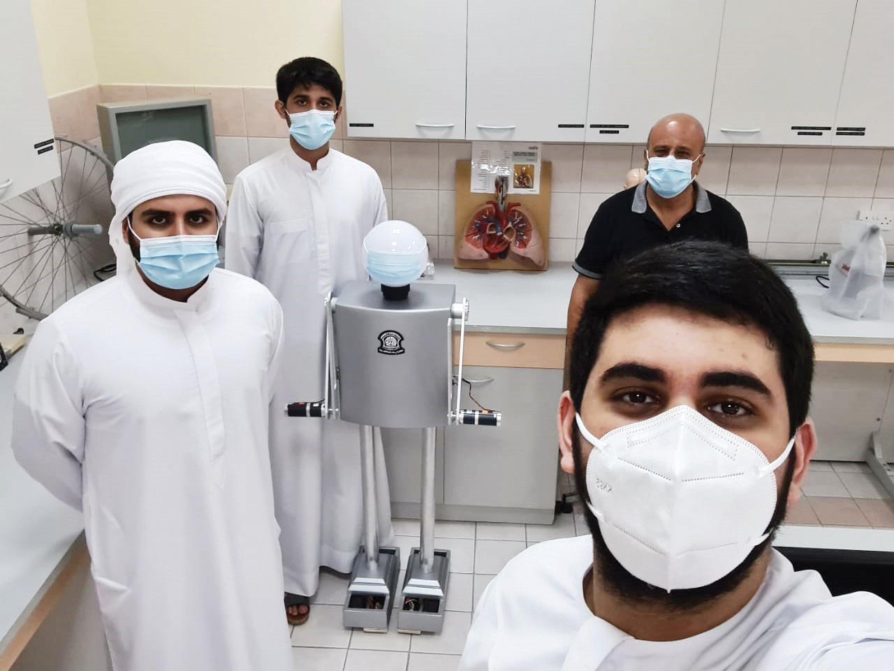 وأوضح محمد حامد الهاشمي، وحسن عبد العزيز فولاد، وعبد الرحمن سلطان الرميثي، الذين نفذوا المشروع تحت إشراف المعلم منير أحمد من مدرسة الاتحاد الخاصة- الممزر، إن الروبوت يتحدث بطلاقة باللغتين العربية والإنجليزية، ويقدم النصائح والتعليمات حول فيروس (كوفيد 19)، باللغتين ويقوم الروبوت بالتعقيم الفوري للمنطقة المحيطة به، وينتقل بشكل مستقل إلى محطته لإعادة الشحن.
