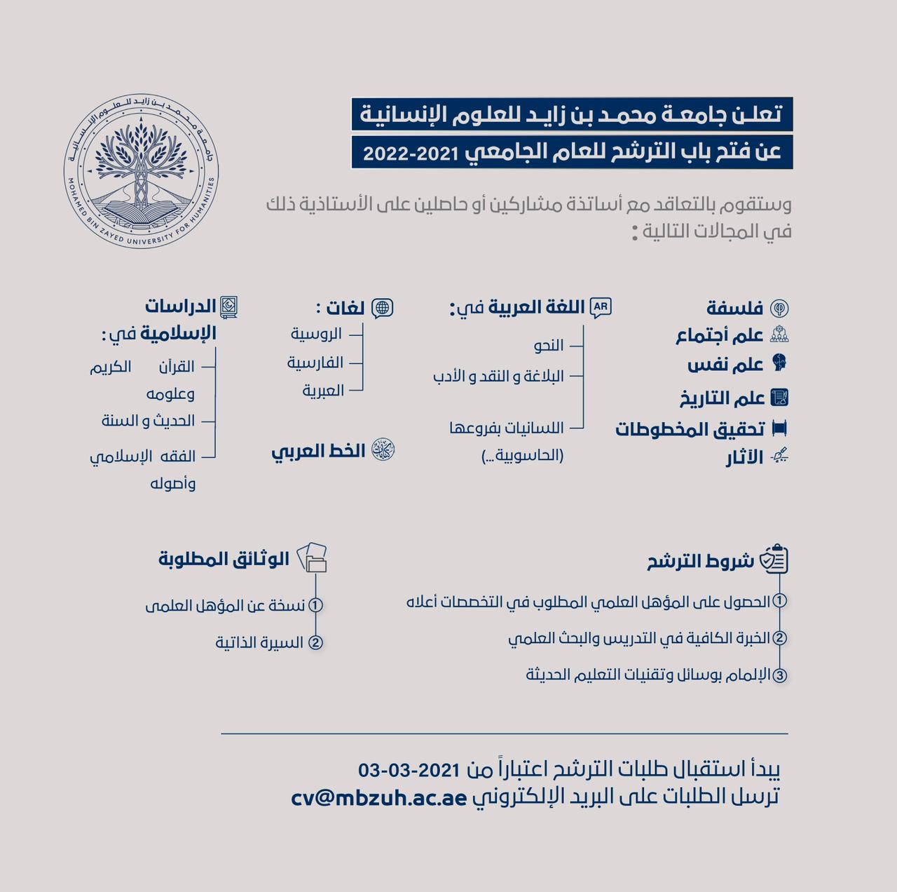 أعلنت جامعة محمد بن زايد للعلوم الإنسانية عن فتح باب التوظيف للهيئة التدريسية في الجامعة للعام 2021-2022، وذلك بالتعاقد مع أساتذة مشاركين أو حاصلين على الأستاذية في اللغة العربية، في تخصصات النحو والبلاغة والنقد والأدب واللسانيات بفروعها (الحاسوبية) بالإضافة إلى تخصصات الفلسفة وعلم اجتماع وعلم نفس وعلم التاريخ والآثار والمخطوطات والخط العربي.