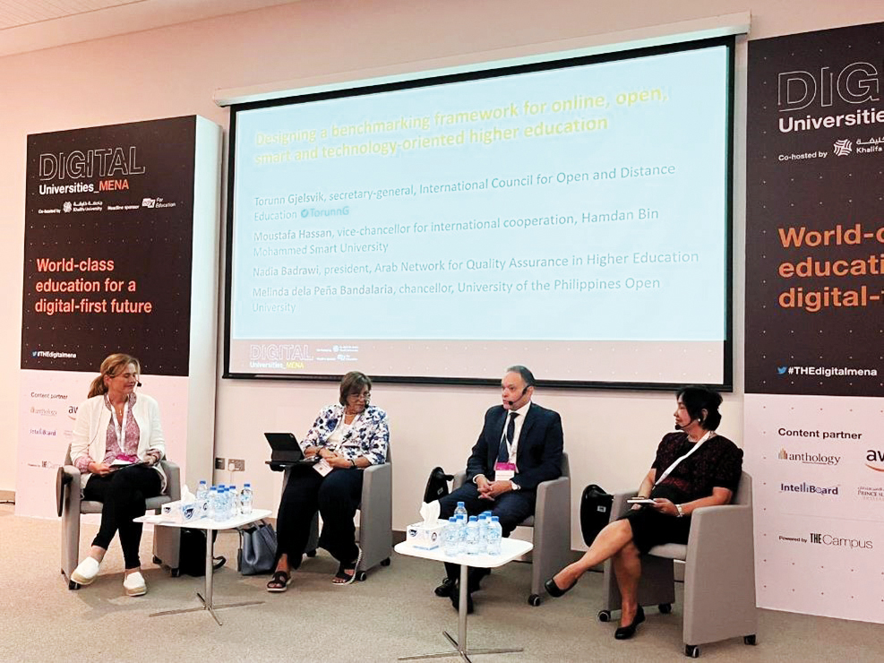 وشهدت القمة مشاركة البروفيسور مصطفى حسن، نائب رئيس الجامعة للتعاون الدولي، في جلسة نقاش تحت شعار: الإطار المرجعي لمؤسسات التعليم العالي الإلكترونية والمفتوحة والذكية والمعززة بالتكنولوجي. وركزت الجلسة على الدور الذي يلعبه الإطار المرجعي في دعم جهود الجامعات في المنطقة، والرامية للارتقاء بجودة العملية التعليمية وضمان استمرارية التعليم العالي.