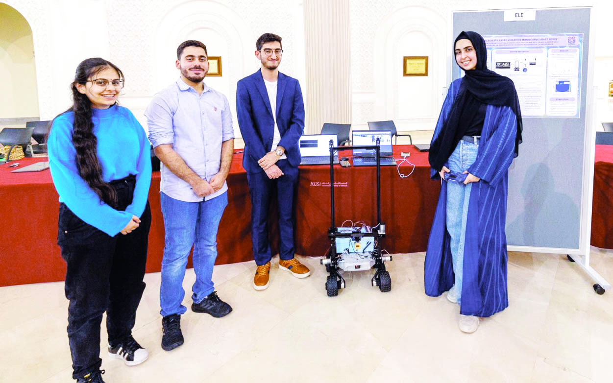 ابتكر 4 طلاب يدرسون بكلية الهندسة، بالجامعة الأمريكية في الشارقة تخصص هندسة كهربائية، وهم: زينة الناصر، وتالة العبوة، ورمزي الشعراوي، وياسر خميس روبوتاً ذكياً، يهدف إلى تقييم المخاطر في المنشآت الصناعية، من خلال قياس الذبذبات الميكانيكية في تلك المنشآت، فيحدد مدى الخطورة فيها، حيث تم تزويده بحساسات، وكاميرتين، ومولد طاقة مصغر، الأمر الذي يمكنه من الحركة في اتجاهين، وبسرعة الصوت، وبإمكان الروبوت اكتشاف أي ذبذبات في الماكينات الناتجة عن حركة الأجسام الميكانيكية، من خلال جهاز مايكرويف «موجات متناهية الصغر»، تمكن من اكتشاف أي أعطال في الماكينات، وبالتالي تقليل الخسائر المادية في تلك المنشآت.