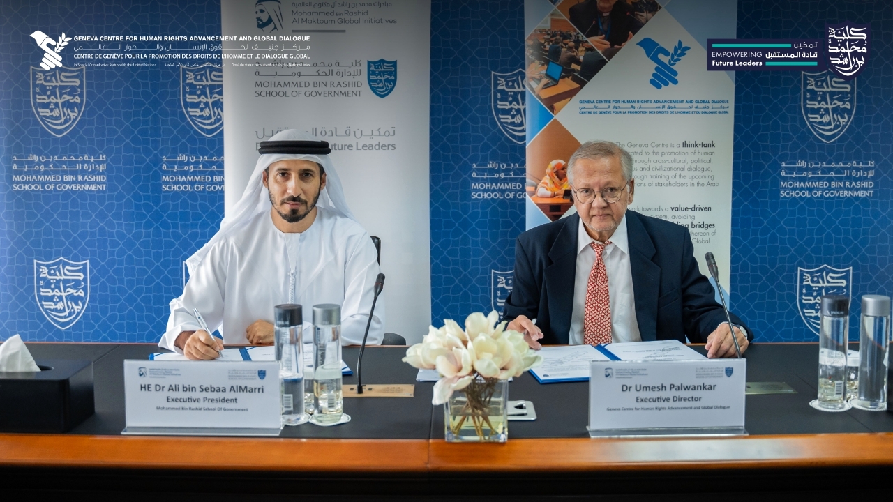 وقعت كلية محمد بن راشد للإدارة الحكومية اتفاقية مع مركز جنيف لحقوق الإنسان والحوار العالمي «GCHRAGD»، بهدف تعزيز التعاون وتبادل الخبرات والمعرفة في مجالات التعليم والبحوث والتعليم التنفيذي، والعمل على دراسات بحثية نوعية جديدة في السياسات العامة والحوكمة، ومواضيع أخرى متخصصة.