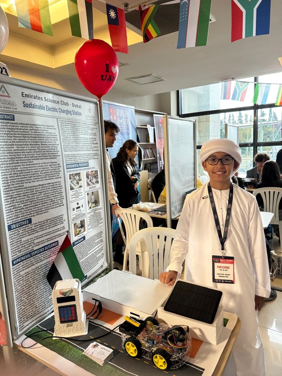 ابتكر الطالب الإماراتي علي حميد اللوغاني، الذي ينتسب لنادي الإمارات العلمي، محطة شحن كهربائية مستدامة ونال عنها الميدالية الذهبية في المعرض الدولي للهندسة والعلوم والفنون الذي أقيم في تركيا أخيراً.