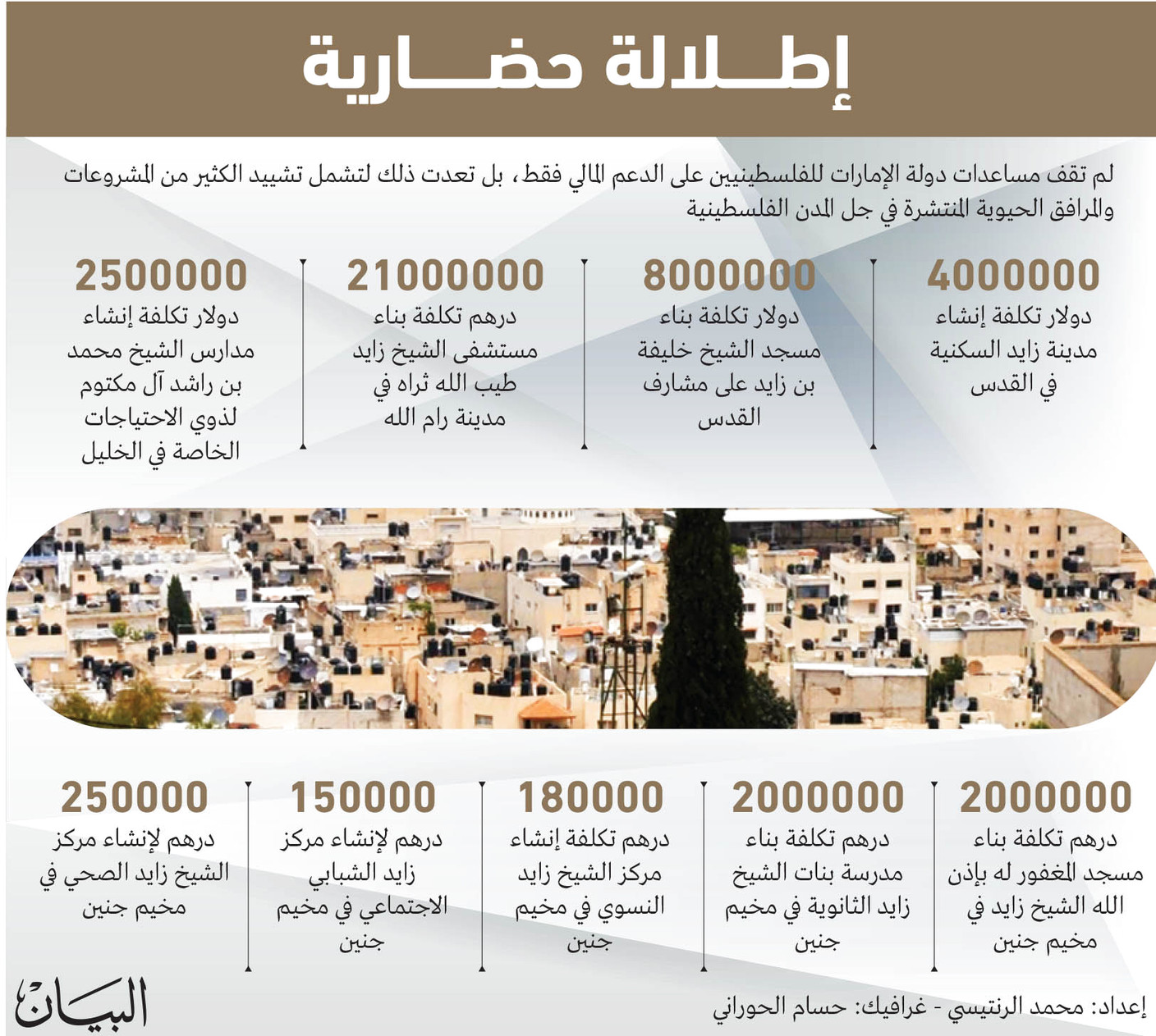تطل دولة الإمارات على الأعين بقوة أينما اتجهت الأنظار على امتداد أراضي فلسطين عبر العديد من الشواهد الحضارية والخيرية والدينية والاجتماعية، وبما يُشعر الجميع بأنّ الإمارات قد حطّت رحالها في القدس والخليل ورام الله ونابلس وجنين.