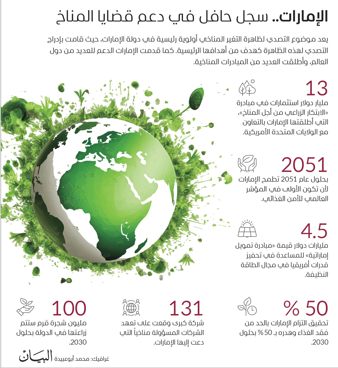 بدعم قيادتنا الرشيدة، تعمل الإمارات منذ سنوات على هذا النهج على المستويين المحلي والعالمي، وكانت الإمارات أولى دول الشرق الأوسط بالإعلان عن مبادرتها الاستراتيجية لتحقيق الحياد المناخي بحلول عام 2050، ومنذ ذلك الحين، تعمل الدولة ممثلة بكل الجهات المعنية على مسار تحقيق الحياد المناخي.