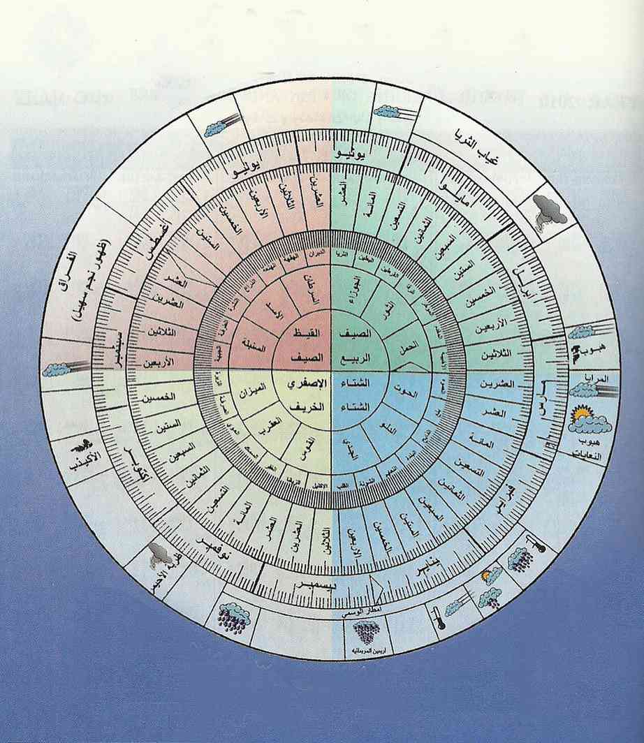 ويستعرض تقويم الدرور تقسيم أيام السنة بشكل عشري إلى (36) قسماً، كل قسم يتألف من عشرة أيام تعرف "بالدّر" ويبدأ هذا الحساب بطلوع نجم سهيل عند منتصف شهر أغسطس من كل عام حيث يعرف كل دّر بالمجموعة العشرية التي ينتمي إليها.