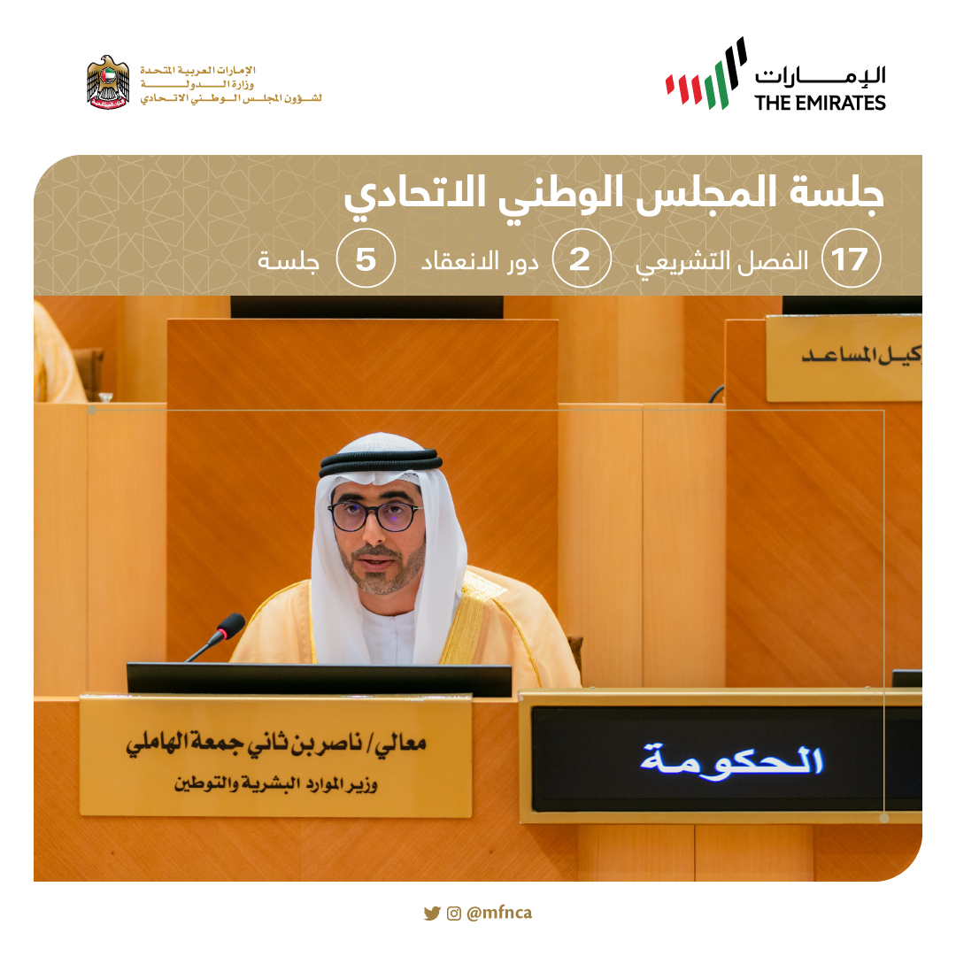 وكان المجلس وجه بعض الأسئلة إلى معالي ناصر بن ثاني الهاملي وزير الموارد البشرية والتوطين، تتناول إجراءات وزارة الموارد البشرية والتوطين للحد من ظاهرة العمل في فترة الحرمان، وإنشاء مراكز تدبير، وما يتعلق بمكاتب استقدام الخدم على مستوى الدولة.