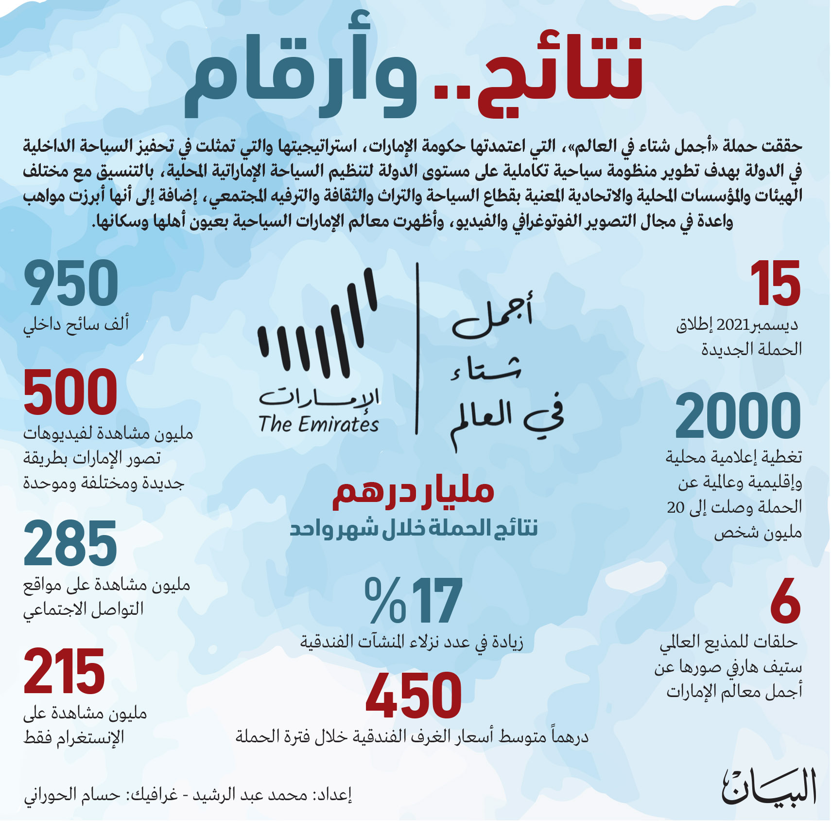 وكان صاحب السمو الشيخ محمد بن راشد آل مكتوم، أطلق الحملة الشهر الماضي تزامناً مع اعتماد استراتيجية السياحة الداخلية والهوية السياحية الموحدة في القطاع السياحي، كإطار عام موحد للخطط والبرامج والمبادرات الحكومية الهادفة لتعزيز السياحة الداخلية، ومن ضمنها حملة «أجمل شتاء في العالم». وأشاد معاليه بالدور الداعم لوسائل الإعلام التي احتفت بحملة أجمل شتاء في العالم لتحقق أكثر من 2000 تغطية إعلامية محلية وإقليمية وعالمية عن الحملة وصلت إلى 20 مليون شخص.