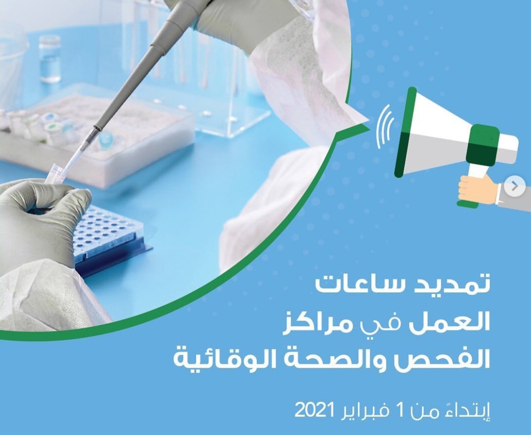 فقد تقرر تمديد ساعات العمل في مركز الفحص والصحة الوقائية في أبو ظبي من الساعة 7 صباحا إلى 7 مساء من الأحد إلى الخميس، وأيام السبت من 8 صباحا إلى 5 مساء، ومركز المصفح من الساعة 7 صباحا إلى 5 مساء من الأحد إلى الخميس، وأيام السبت من 8 صباحا إلى 5 مساء.