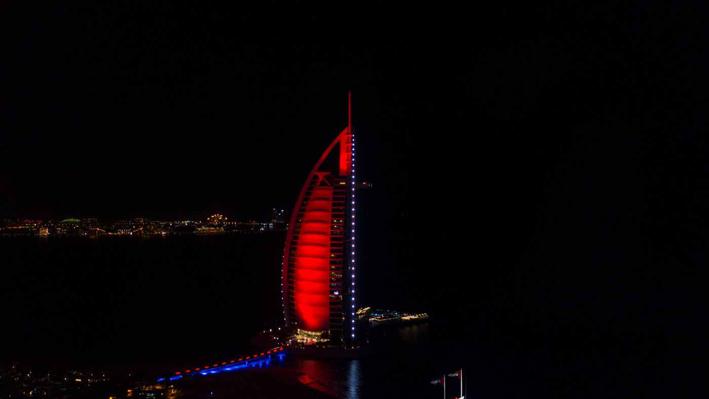 وتفصيلاً، تكتسي أبرز معالم ومباني دبي باللون الأحمر بما في ذلك مركز محمد بن راشد للفضاء، ومتحف الاتحاد، ومتحف المستقبل، ومتحف دبي، ومركز دبي المالي العالمي، ومركز التجارة العالمي، وإكسبو2020، ومكتبة محمد بن راشد، وأكاديمية شرطة دبي، والقرية العالمية، وبرواز دبي، ومبنى القيادة العامة لشرطة دبي، ومبنى الادارة العامة للأدلة الجنائية، ونادي ضباط شرطة دبي، وهيئة الطرق والمواصلات ومعالم قناة دبي المائية، وهيئة كهرباء ومياه دبي "ديوا".