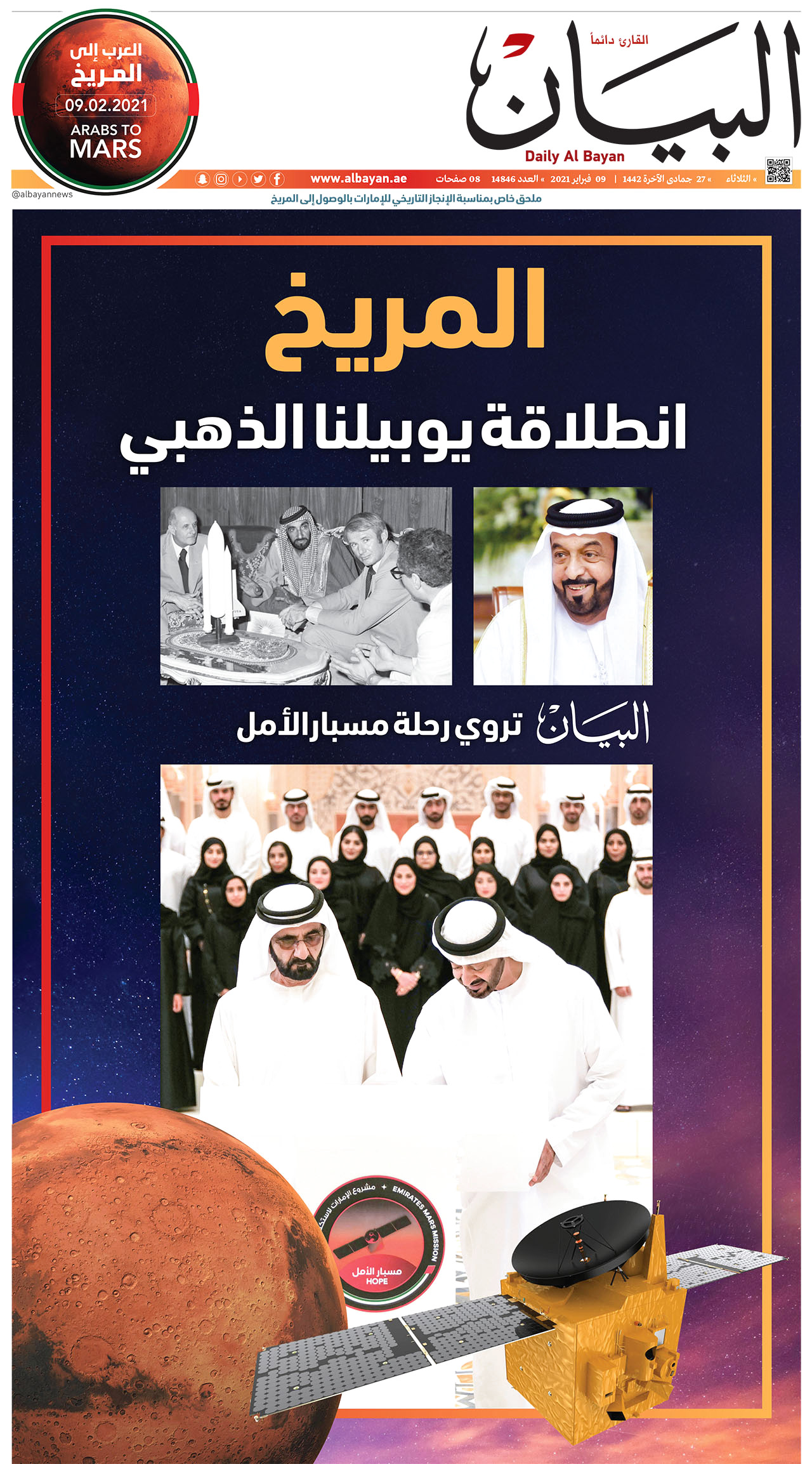 «البيان» تروي رحلة مسبار الأمل من طموح زايد حتى قهر التحدياتالمريخ انطلاقة يوبيلنا الذهب ملحق خاص بمناسبة الإنجاز التاريخي للإمارات بالوصول إلى المريخ. اقرأ أيضاً: أبناء الإمارات يعانقون الفضاء العالم يترقب المريخ بعيون إماراتية «اللا مستحيل» رسائل الإمارات للعالم رؤية زايد جسدت زيادة الإمارات لمشاهدة الملحق PDF اضغط هنا