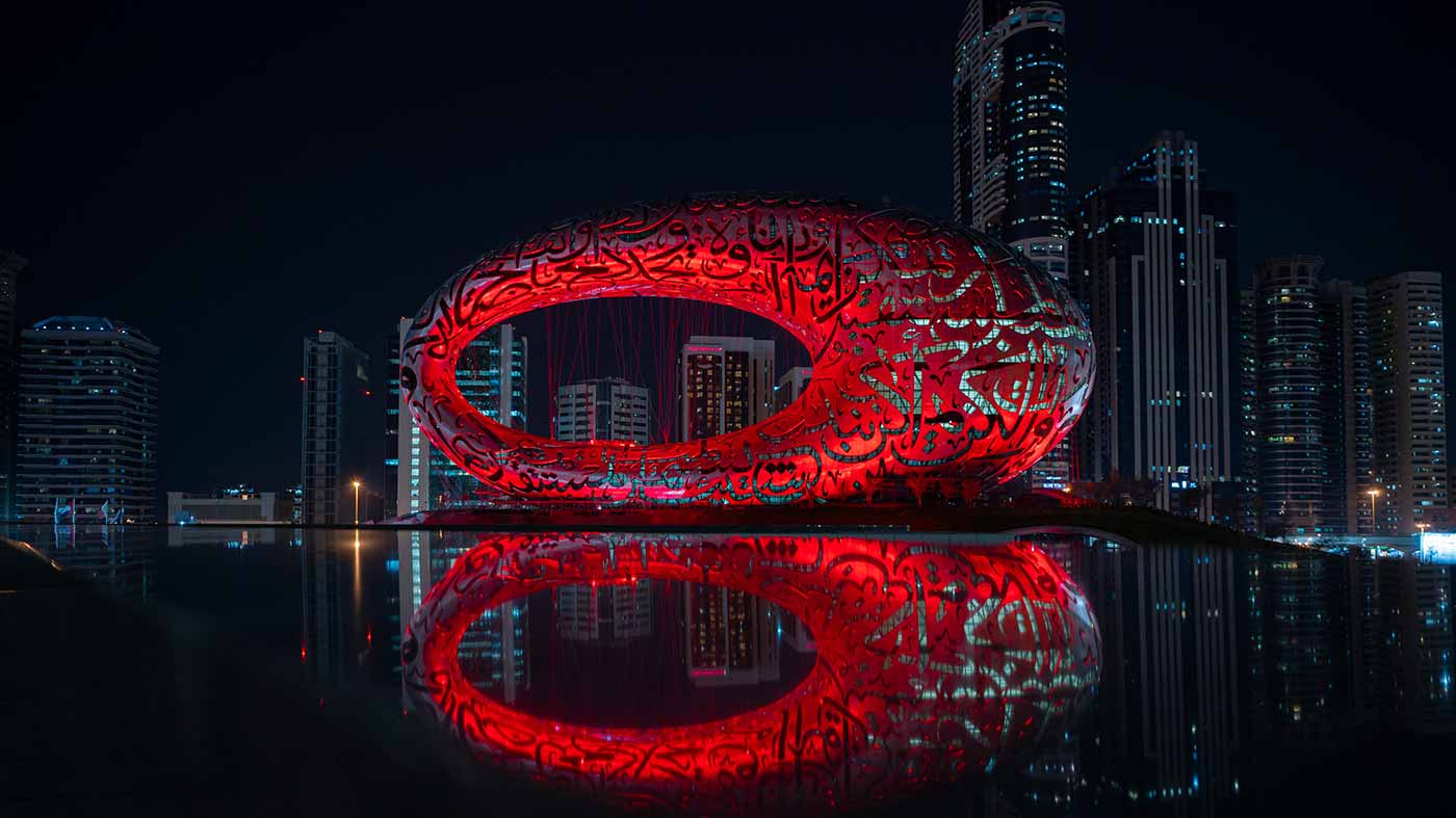 كما أكتسى مبنى المركز المالي العالمي الذي يعد مركزا عالمياً لصناعة المال والتجارة والاقتصاد، باللون الأحمر، إضافة إلى برواز دبي الذي يعتبر أعجوبة في البناء والمعمار، وتزين أيضا، متحف المستقبل بذات اللون، وكل مباني الاتصالات، ومركز محمد بن راشد للفضاء، ومتحف الاتحاد، ومتحف دبي، ومركز التجارة العالمي، وإكسبو2020، ومكتبة محمد بن راشد، وأكاديمية شرطة دبي، ومبنى القيادة العامة لشرطة دبي، ومبنى الادارة العامة للأدلة الجنائية، ونادي ضباط شرطة دبي، وهيئة الطرق والمواصلات ومعالم قناة دبي المائية، وهيئة كهرباء ومياه دبي "ديوا" ، وذلك تعبيراً عن لحظات عظيمة في تاريخ الإمارات والعرب والإنسانية، لحظات صنعتها الإرادة والتصميم والقدرة.