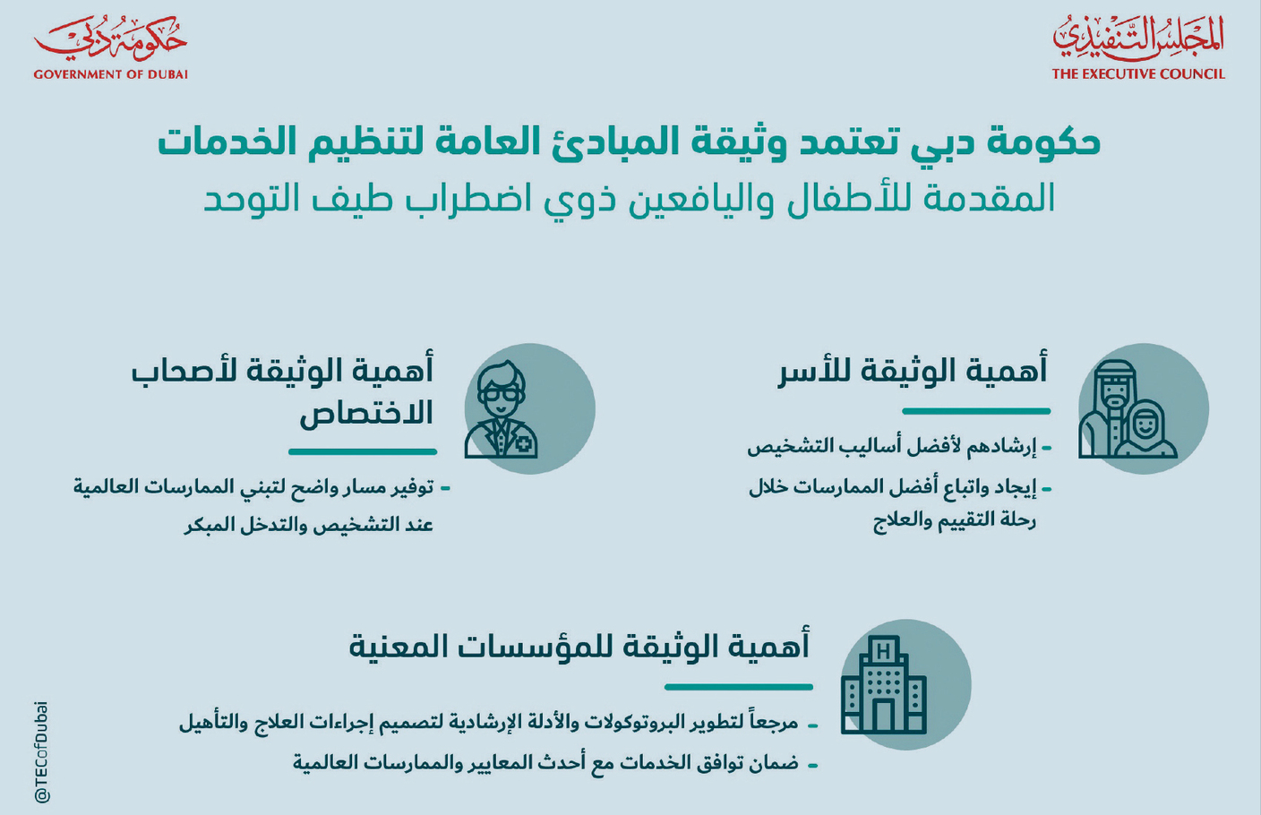 اعتمدت حكومة دبي وثيقة المبادئ العامة لتنظيم الخدمات المقدمة لذوي اضطراب طيف التوحد، من الأطفال واليافعين من تبدأ منذ الولادة إلى عمر 18 عاماً.