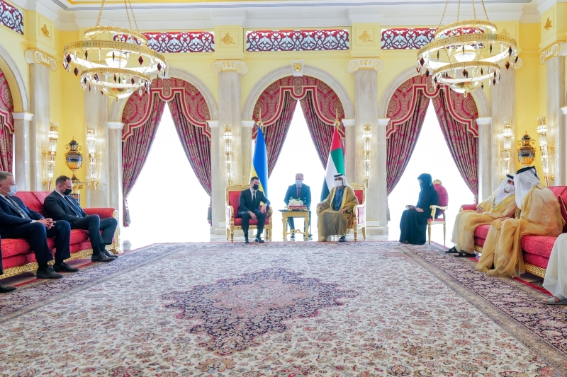 ومعالي محمد إبراهيم الشيباني مدير عام ديوان صاحب السمو حاكم دبي، وخليفة سعيد سليمان مدير عام دائرة التشريفات والضيافة في دبي، وسالم أحمد سالم الكعبي سفير الدولة لدى جمهورية أوكرانيا. كما حضر اللقاء والمحادثات الوفد المرافق للرئيس والذي يضم وزراء الخارجية والداخلية والزراعة والغذاء، إلى جانب يوري بولوريز سفير جمهورية أوكرانيا لدى الدولة.