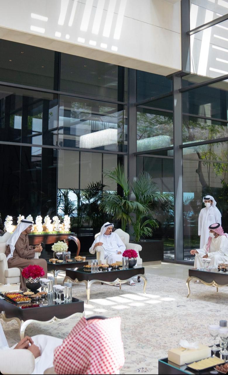 حضر اللقاء.. سمو الشيخ عمار بن حميد النعيمي ولي عهد عجمان وسمو الشيخ حمدان بن محمد بن زايد آل نهيان والشيخ محمد بن حمد بن طحنون رئيس مجلس إدارة مطارات أبوظبي والشيخ عبدالعزيز بن حميد النعيمي رئيس دائرة التنمية السياحية والشيخ راشد بن حميد النعيمي رئيس دائرة البلدية والتخطيط في عجمان وعدد من الشيوخ وكبار المسؤولين.