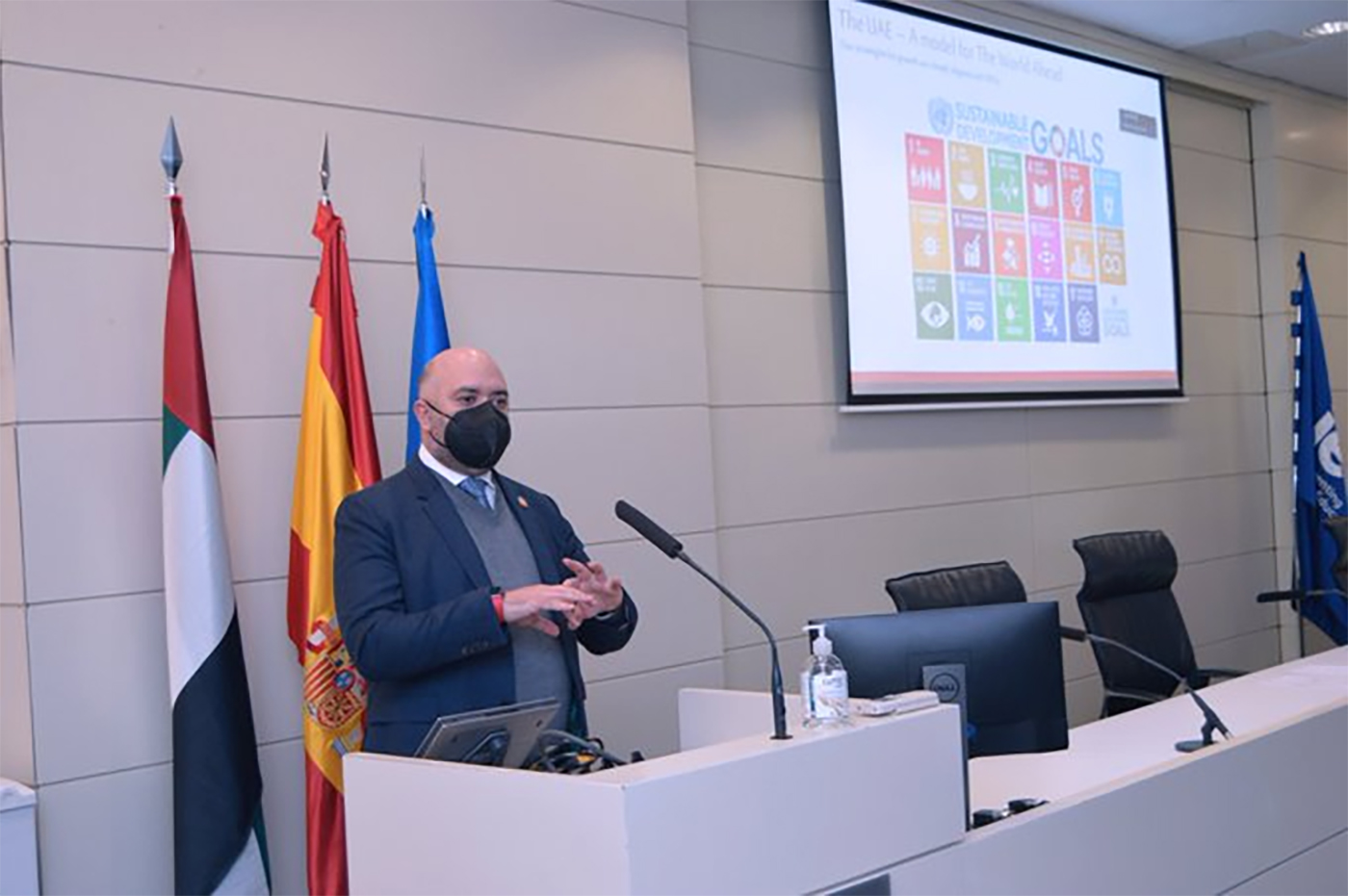 ألقى ماجد حسن السويدي سفير الدولة لدى المملكة الإسبانية، محاضرة بعنوان «نحو عالم جديد: العلاقات الدولية والتطور المستدام»، في كلية إدارة الأعمال بمدريد، بحضور طلبة قسم الدراسات الجيوسياسية والدبلوماسية، تحدث خلالها عن رؤية دولة الإمارات المستقبلية، واهتماماتها بمجالات الاستدامة والطاقة النظيفة، ودور الذكاء الاصطناعي والتكنولوجيا في تطوير مجالات الطاقة المتجددة.