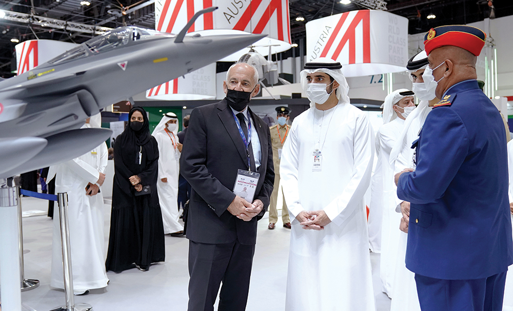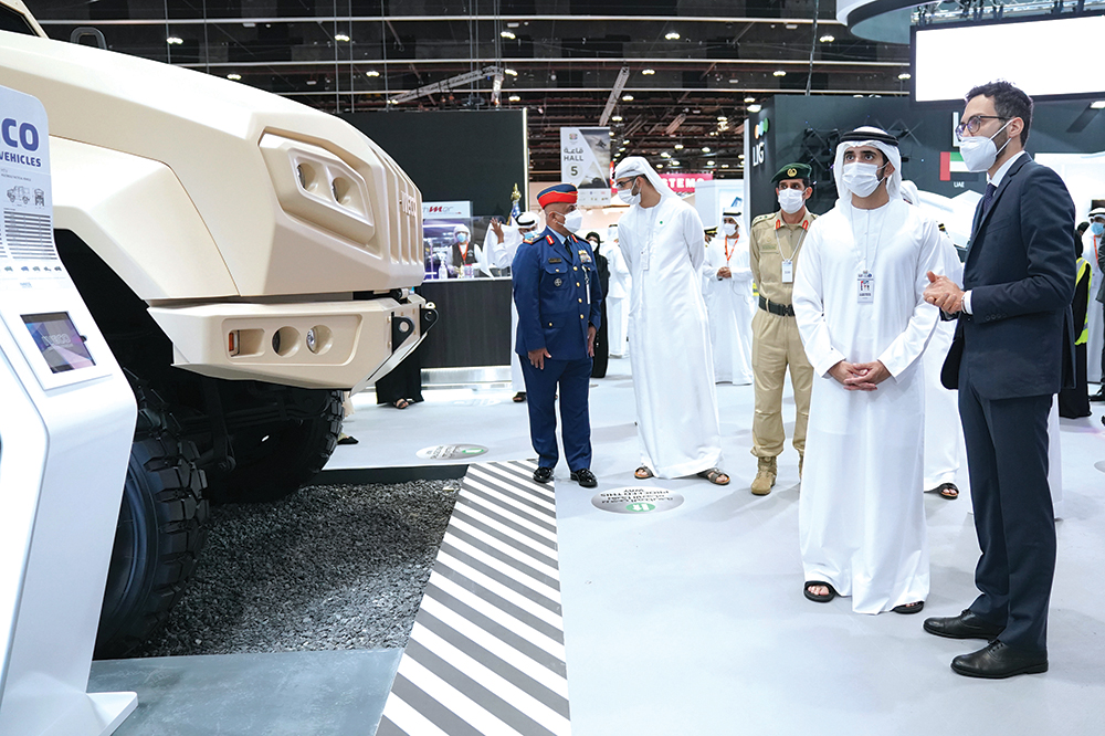 وأبدى سموه ثقته بالتنافسية الاحترافية لشركاتنا الوطنية الوليدة والمتخصصة في أنظمة وتقنيات الصناعات العسكرية الدفاعية، التي تعكس حرص قيادتنا الرشيدة، وعلى رأسها صاحب السمو الشيخ خليفة بن زايد آل نهيان رئيس الدولة، حفظه الله، وصاحب السمو الشيخ محمد بن راشد آل مكتوم نائب رئيس الدولة رئيس مجلس الوزراء حاكم دبي، رعاه الله، على توفير جميع التسهيلات والفرص التعليمية والتدريبية لشباب الوطن، من أجل بناء قاعدة صناعية متقدمة، تعتمد على عقول وابتكارات وسواعد كوادرنا الوطنية الشابة، التي تحظى بدعم وتوجيهات صاحب السمو الشيخ محمد بن زايد آل نهيان ولي عهد أبوظبي نائب القائد الأعلى للقوات المسلحة، الذي يعتز أيما اعتزاز بقدرات أبناء زايد وإنجازاتهم العلمية والتقنية التي ترفع راية دولة الإمارات عالياً، وتحقق تطلعات شعبنا الوفي نحو المجد وصناعة تاريخ دولتنا الحديث.