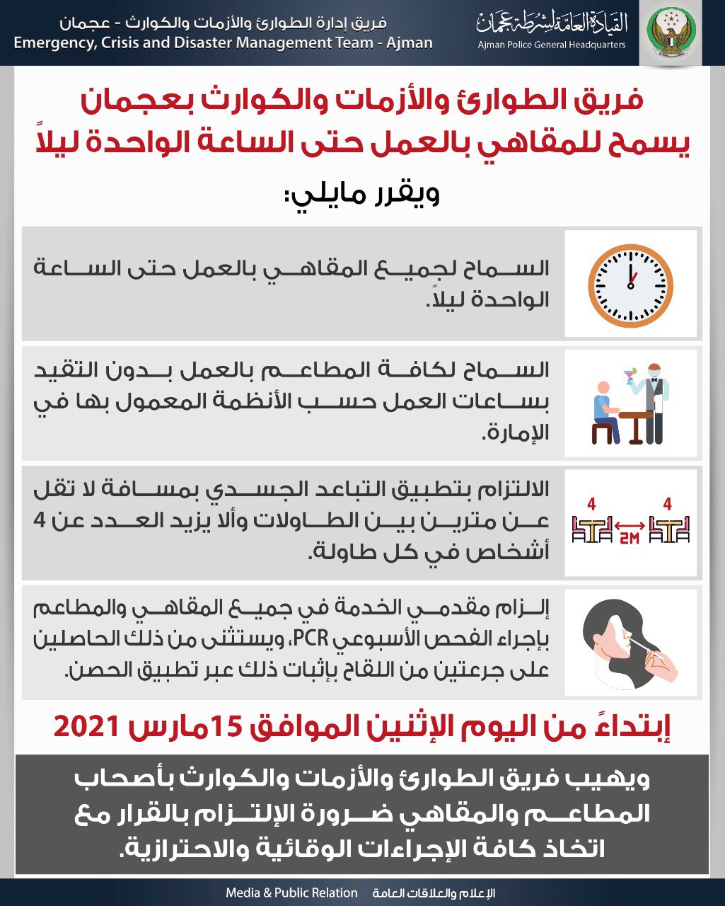 أعلن فريق إدارة الطوارئ والأزمات والكوارث بعجمان عن حزمة من الإجراءات الوقائية الجديدة للحد من انتشار فيروس كورونا، ابتداء من اليوم الإثنين الموافق 15 مارس 2021.