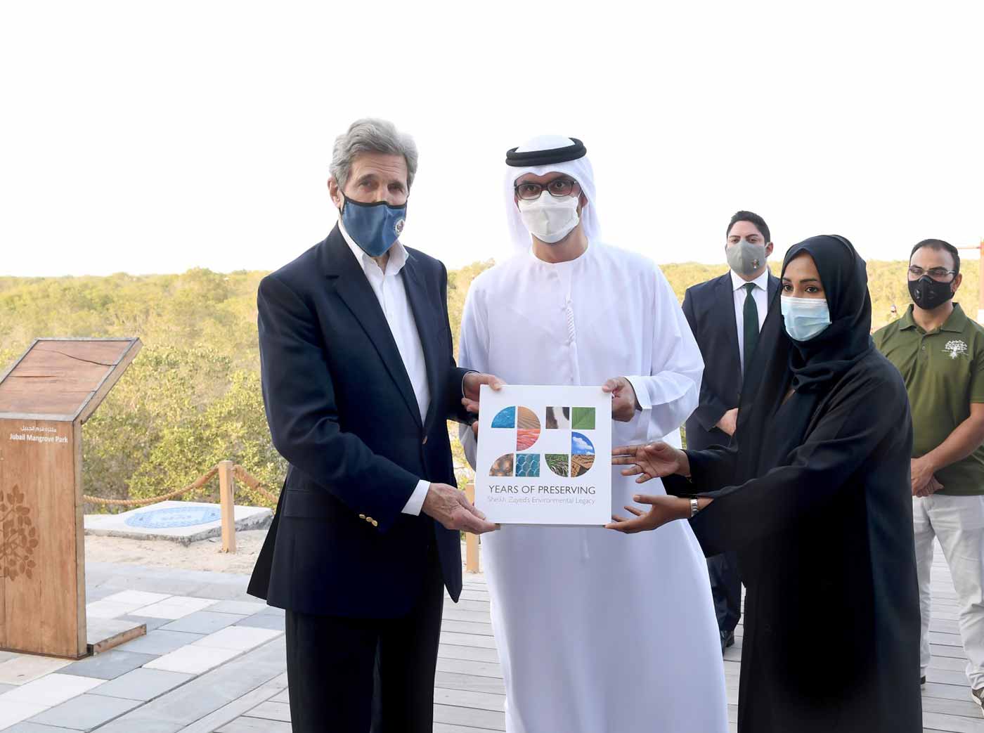 واختتم معالي جون كيري جولته، بزيارة حديقة المانجروف بالجبيل في أبوظبي، حيث تعرف خلالها عن كثب على غابات أشجار المانجروف والتي تعتبر من أهم الأشجار المحلية، والتي تتمثل أبرز فوائدها في منع التعرية الساحلية ودعم التنوع البيولوجي، إضافة إلى قدرتها على التقاط الكربون بكميات أكبر من الغابات المطيرة لكل هكتار. وقد تعهدت دولة الإمارات في مساهمتها الثانية المحددة وطنياً بزراعة 30 مليون شجرة بحلول العام 2030 لتضاف إلى الملايين من هذه الأشجار المنتشرة على سواحل الإمارات.