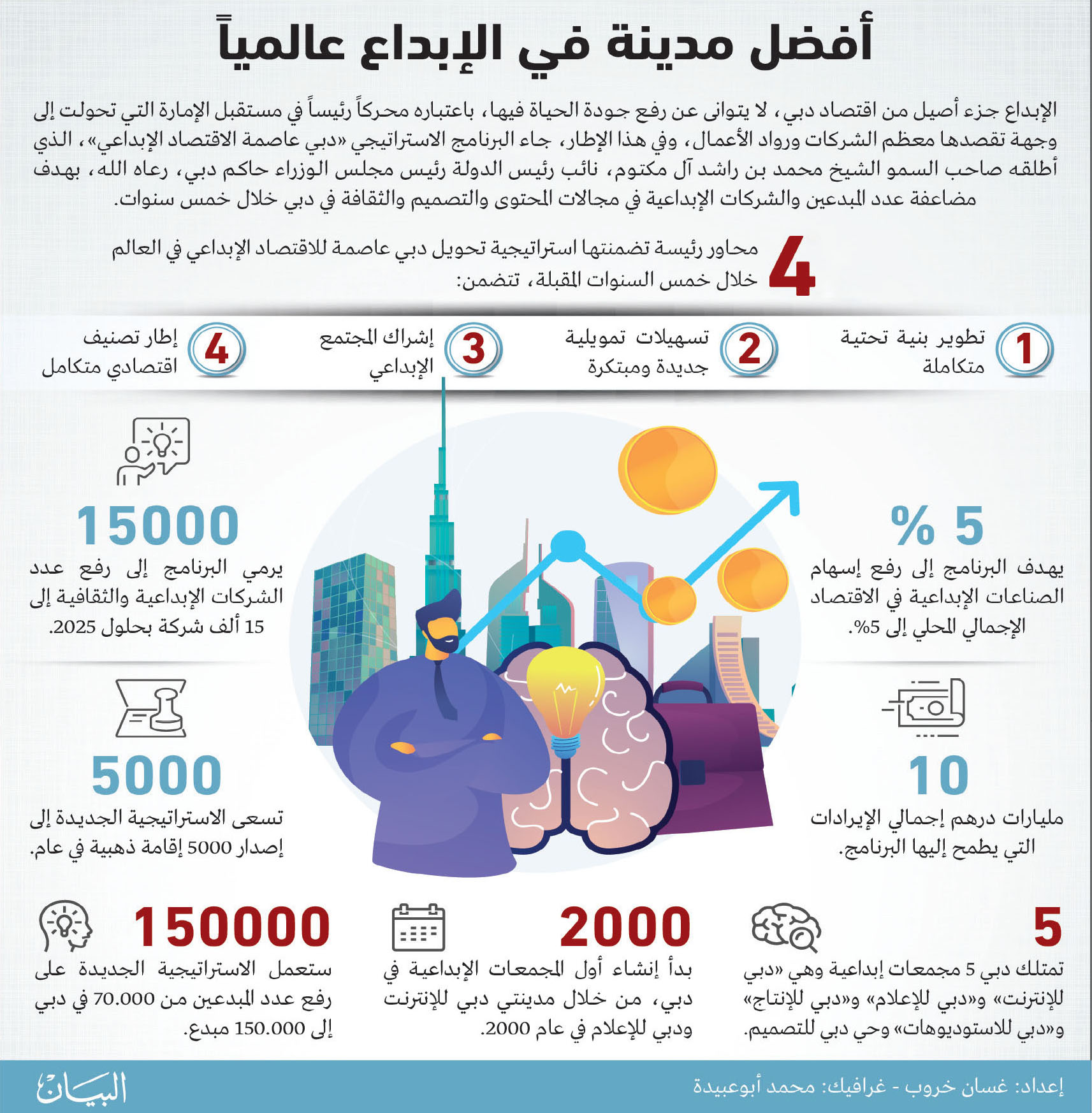 وتتضمن هذه الاستراتيجية المبتكرة، تهيئة البيئة التشريعية والاستثمارية اللازمة لنمو وازدهار القطاع الإبداعي في دبي، وزيادة جاذبية الإمارة للمبدعين والمستثمرين ورواد الأعمال، وكذلك للاستثمارات المحلية والإقليمية والعالمية في القطاع الإبداعي، بما يسهم في تحويل دبي إلى عاصمة عالمية للاقتصاد الإبداعي، ترجمة للرؤية الاستشرافية لصاحب السمو الشيخ محمد بن راشد آل مكتوم، وتنفيذاً لخطة دبي 2021، التي تطمح إلى الارتقاء بمكانة إمارة دبي الريادية، كمركز عالمي في مختلف المجالات، بما في ذلك الاقتصاد والمال والأعمال، علماً بأن خطة دبي 2021، تنظر إلى مستقبل الإمارة من خلال منظور شامل، لضمان خلق مجتمع السعادة، وتحقيق تطلعات وطموحات المواطنين والمقيمين.