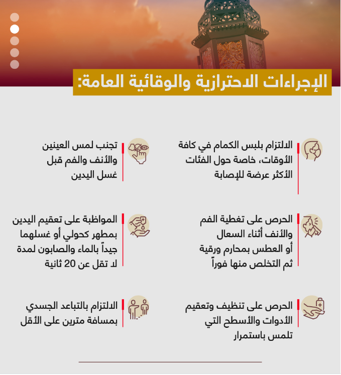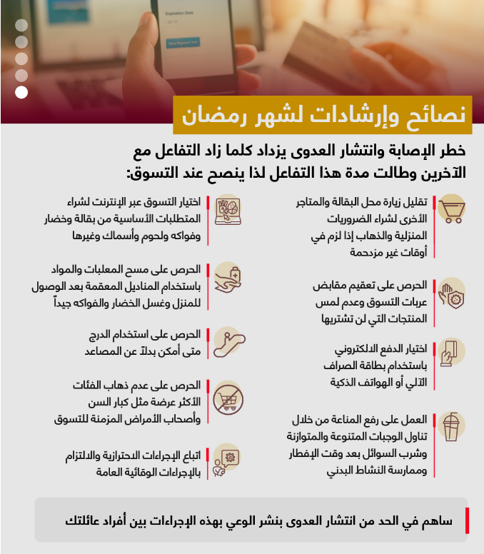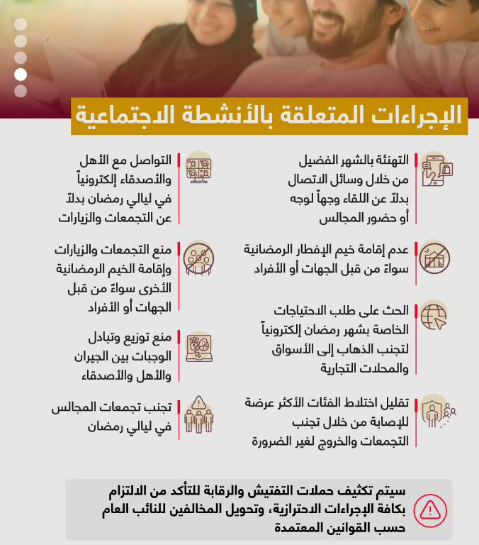 اعتمدت لجنة إدارة الطوارئ والأزمات في أبوظبي، وبالتعاون مع دائرة الصحة ومركز أبوظبي للصحة العامة، الإجراءات الوقائية لشهر رمضان المبارك والمتعلقة بالأنشطة الدينية والاجتماعية، حرصاً على الصحة العامة، وحفاظاً على سلامة جميع أفراد المجتمع.